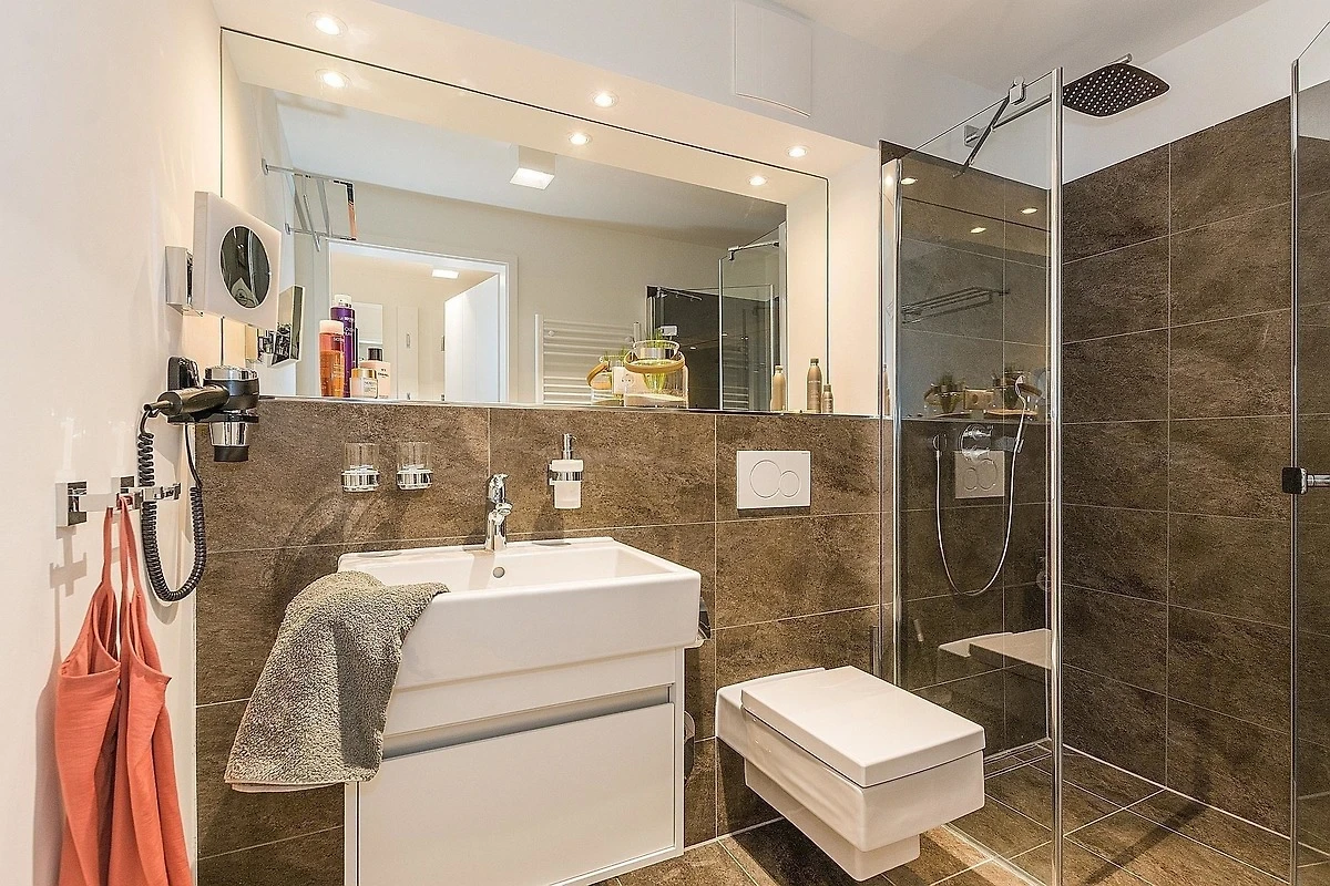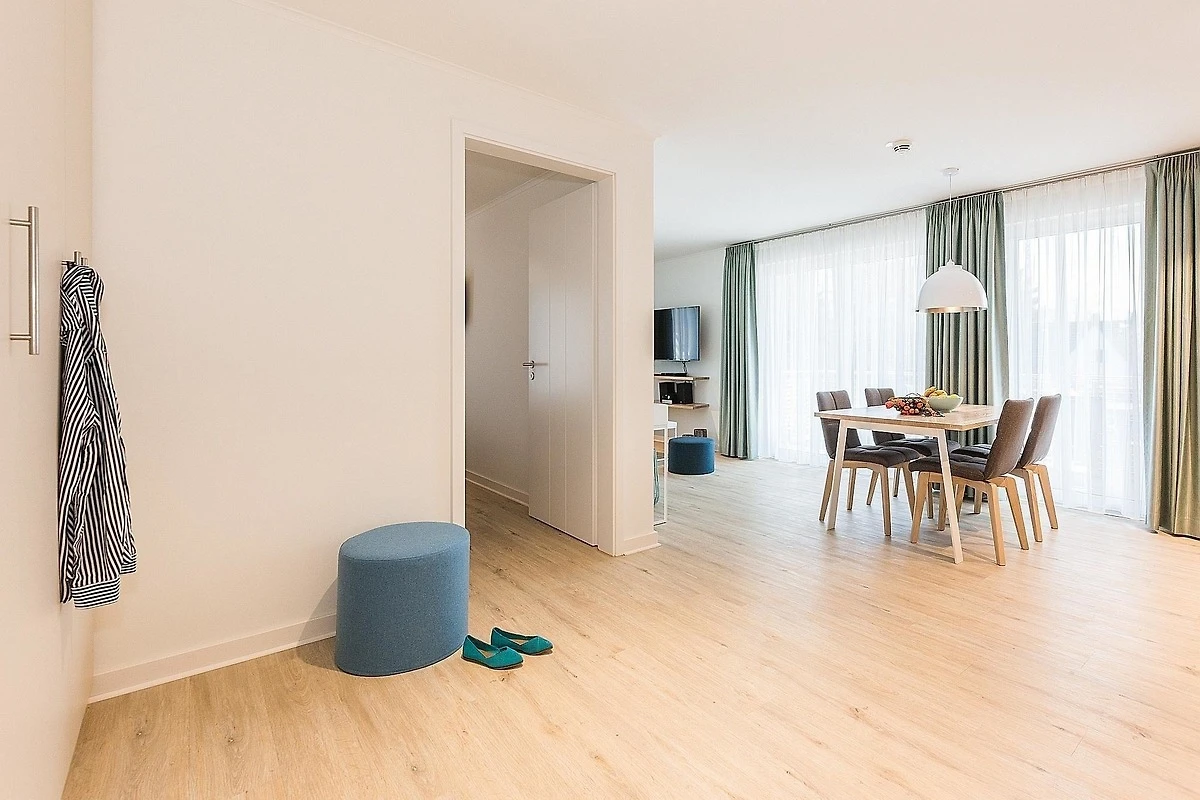 Diese moderne Ferienwohnung bietet grosszügigen Raum für einen erholsamen Aufenthalt. Sie verfügt über zwei Schlafzimmer mit insgesamt vier komfortablen Doppelbetten, ein helles Wohnschlafzimmer sowie ein stilvolles Badezimmer mit bodengleicher Dusche. Die offene Küche ist vollständig ausgestattet und umfasst einen Geschirrspüler, einen Elektro-/Gasherd, einen Backofen, eine Mikrowelle, einen Kühlschrank mit Gefriermöglichkeit, eine Kaffeemaschine sowie einen Toaster. Für Unterhaltung sorgen eine HiFi-Anlage und ein TV, während WLAN für Internetzugang sorgt. Die Unterkunft ist allergikergeeignet und bietet Annehmlichkeiten wie Fussbodenheizung, Haartrockner, Bügeleisen und Staubsauger. Ein Parkplatz ist ebenfalls vorhanden. Gemeinschaftliche Einrichtungen, einschliesslich Brettspielen und einem Sonnenschirm, runden das Angebot ab. Diese Ferienwohnung ist eine ideale Wahl für Familien oder Gruppen, die Komfort und eine vollausgestattete Umgebung suchen.
