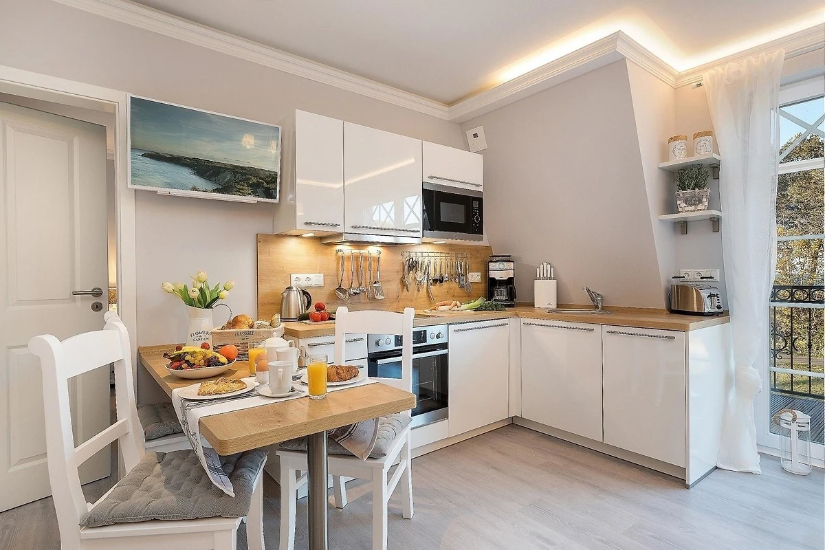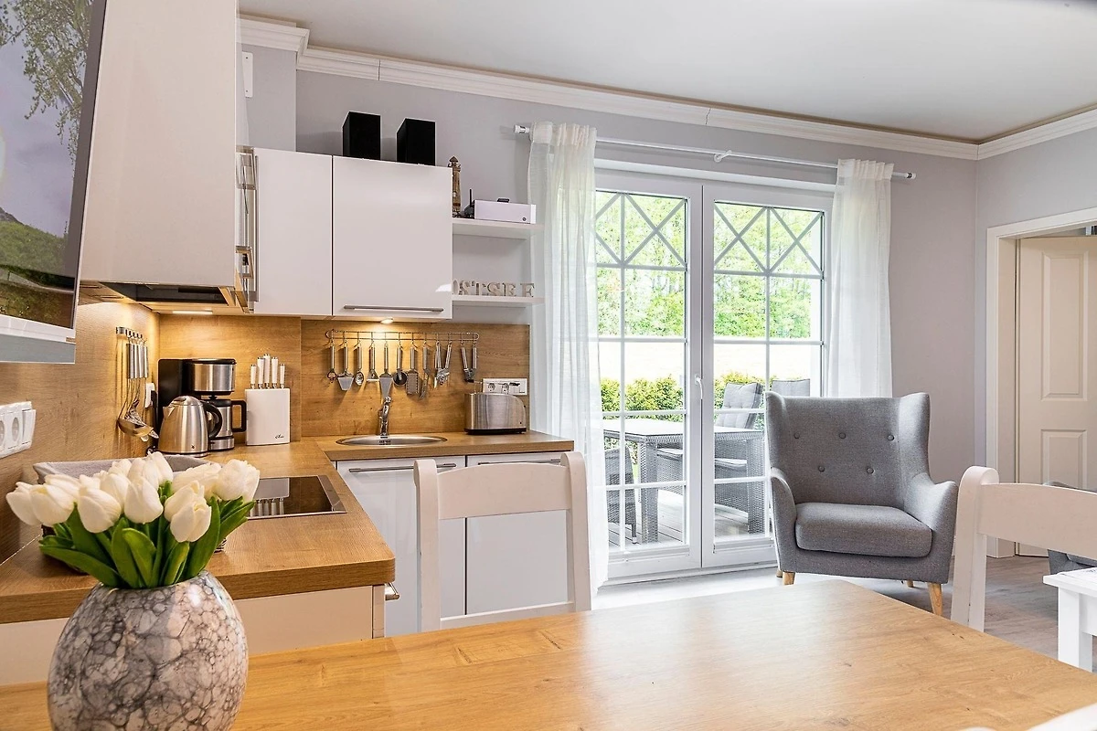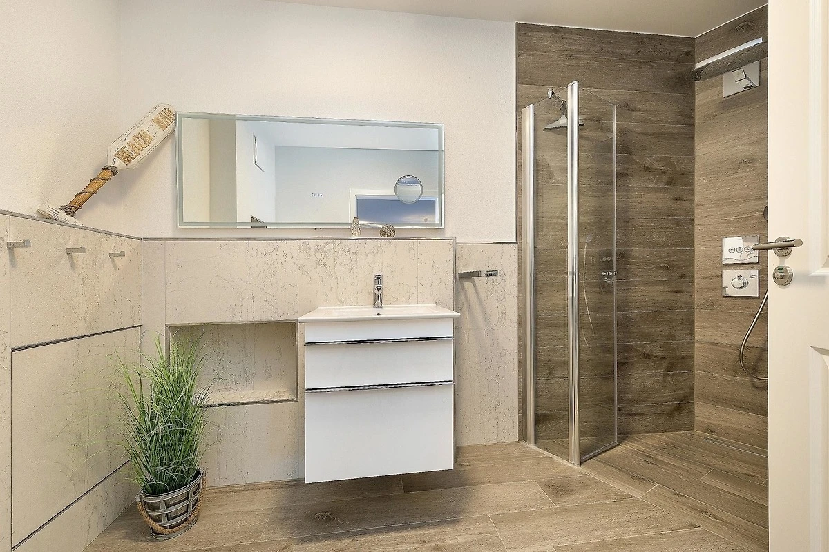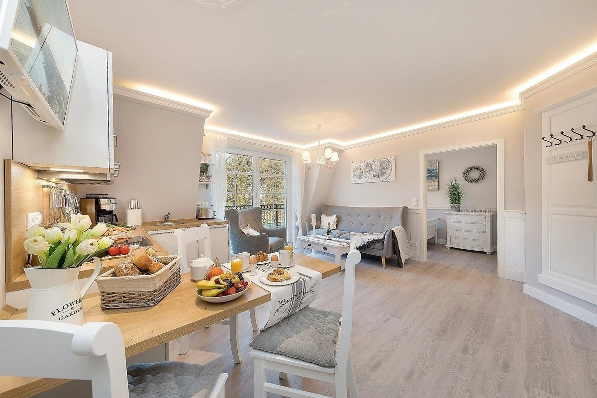 Die Ferienwohnung bietet ein modernes und barrierefreies Ambiente, geeignet für Allergiker. Sie verfügt über zwei Schlafzimmer, eines mit einem komfortablen Doppelbett und das andere mit zwei Einzelbetten. Die offene Küche ist komplett ausgestattet mit einem Elektro-/Gasherd, Backofen, Geschirrspüler, Kühlschrank sowie einer Kaffeemaschine und weiteren Küchenutensilien wie einem Mixer und Toaster. Das Duschbad überzeugt mit einer bodengleichen Dusche, Haartrockner und Kosmetikspiegel. Der Wohnbereich besticht durch ein gemütliches Sofa, Sessel und einen Kamin/Kachelofen für entspannte Stunden. Für Unterhaltung sorgen eine HiFi-Anlage und ein TV. Zudem stehen WLAN, eine Waschmaschine, ein Wäschetrockner und weitere praktische Annehmlichkeiten wie ein Fahrstuhl, Erste-Hilfe-Set und Rauchmelder zur Verfügung. Das stilvolle Ambiente wird durch Fussbodenheizung und hochwertige Ausstattung abgerundet. Spiele und Babyfon ergänzen das Angebot für Familien.