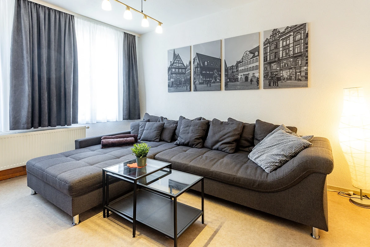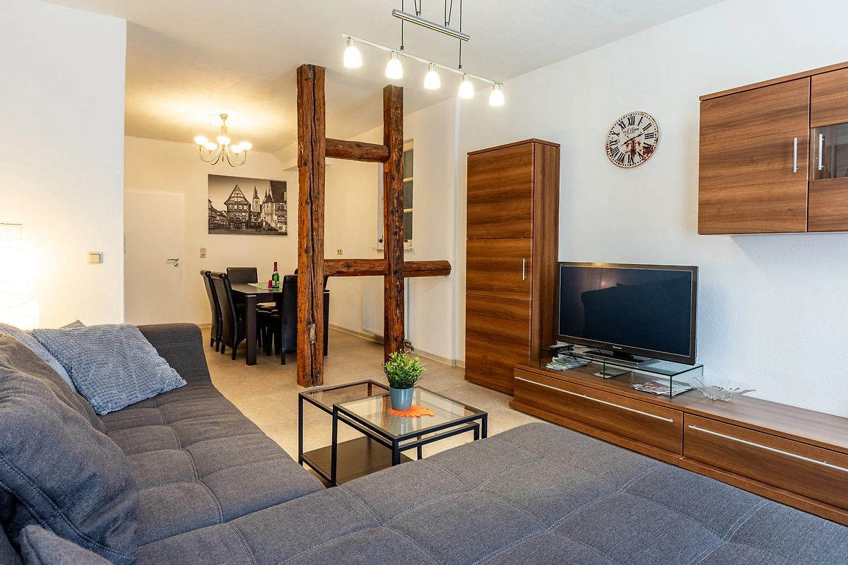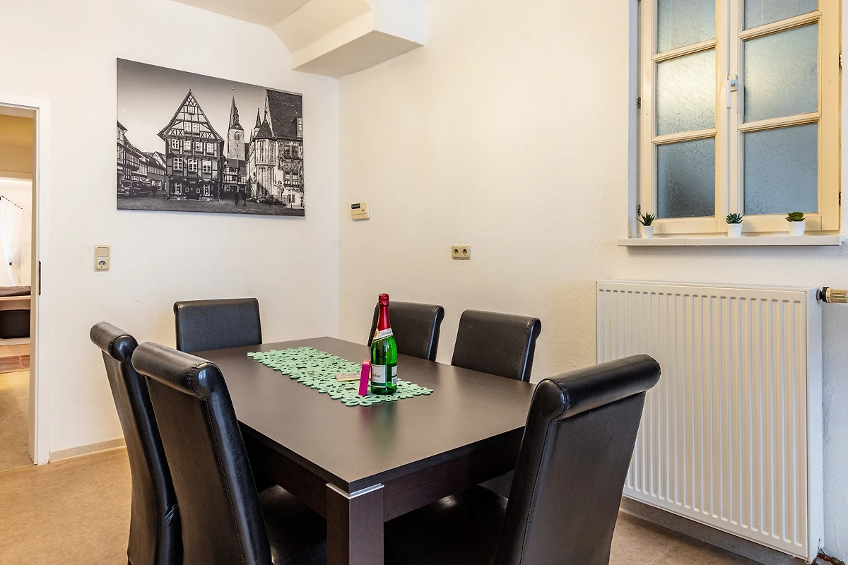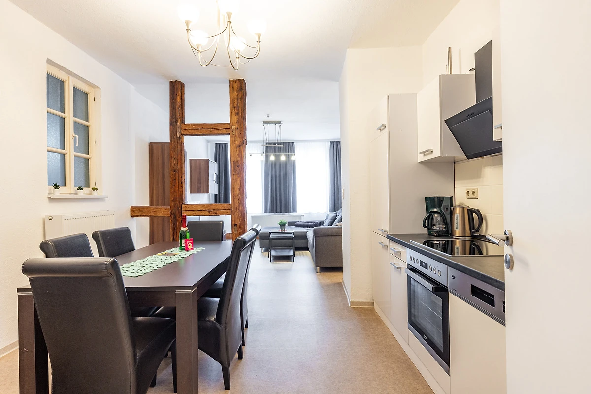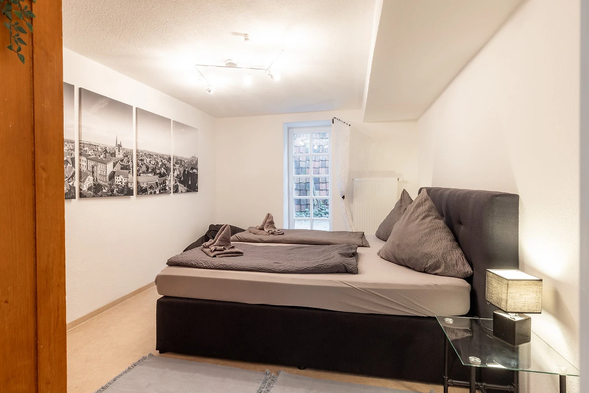 Unsere Ferienwohnung "Zum rost’gen Potte" ist zwar ein echtes Denkmal, trotzdem modern eingerichtet und wurde 2021 frisch renoviert. Im Schlafzimmer entspannen Sie auf einem breiten Boxspringbett - Ihr Gepäck verstauen Sie bequem im separaten Kleiderschrank. Das 2. Schlafzimmer verfügt über 2 Einzelbetten im Himmelbett-Stil. Im Wohnzimmer wartet eine moderne ausziehbare Wohnlandschaft auf Sie - geniessen Sie Ihren Abend bei einem guten Glas Wein und einem Buch oder machen Sie sich einen gemütlichen Fernsehabend vor unserem Flachbild-TV! Die Wohnlandschaft kann bei Bedarf auch in eine dritte Schlafmöglichkeit verwandelt werden. Zusätzlich gibt es im Wohnzimmer einen separaten Essbereich. Die modern eingerichtete Küche verfügt über einen Herd mit Ceranfeld, Backofen, Spülmaschine, Kühlschrank mit Tiefkühlfach, Wasserkocher, Kaffeemaschine und Toaster. Im Bad finden Sie Dusche, Badewanne, Waschbecken, Waschmaschine und WC. Die Ferienwohnung verfügt über kostenloses W-Lan. Fahrräder können in der Hofdurchfahrt sicher und überdacht abgestellt werden.