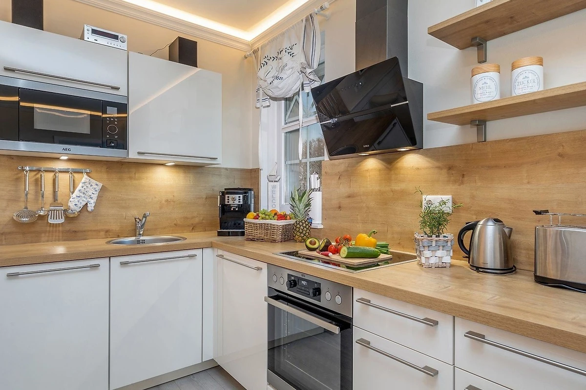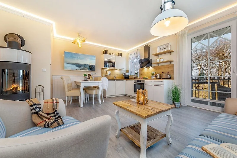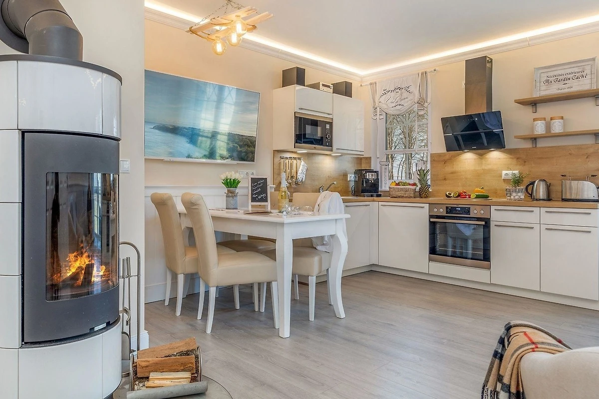 Die offene Küche ist ideal für Selbstversorger und bietet alle notwendigen Geräte, darunter Geschirrspüler, Backofen, Kühlschrank und Kaffeemaschine. Ein Esstisch lädt zum gemeinsamen Verweilen ein. Für besonderen Komfort sorgen WLAN, Fussbodenheizung und ein Kamin. Die barrierefreie Wohnung ist zudem allergikergeeignet und eignet sich für Familien mit Kleinkindern, da Kinderspielzeug und Babyfon bereitstehen. Ein Parkplatz, Fahrstuhl sowie Sicherheitsmerkmale wie Rauchmelder und Erste-Hilfe-Set runden das Angebot ab.