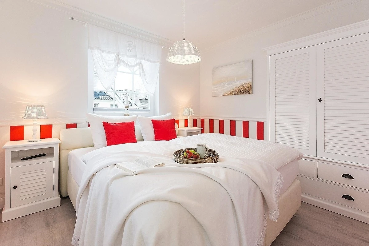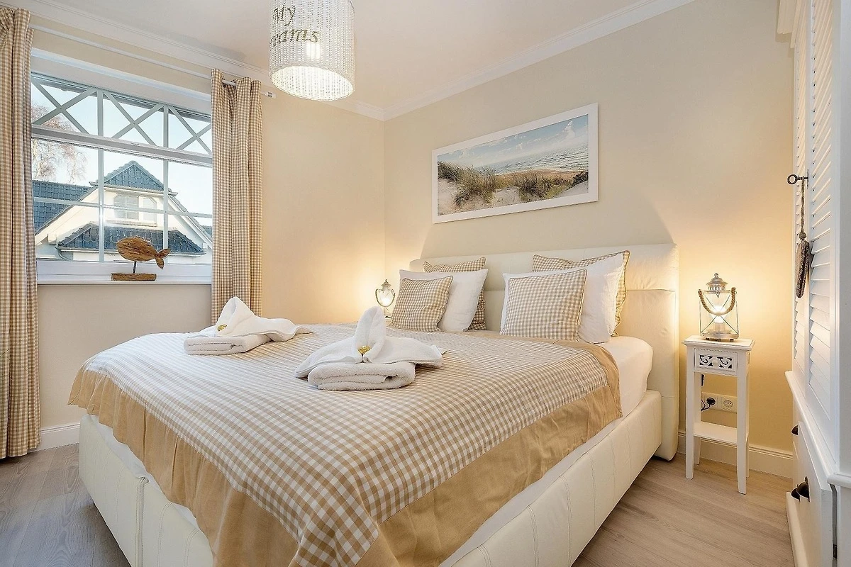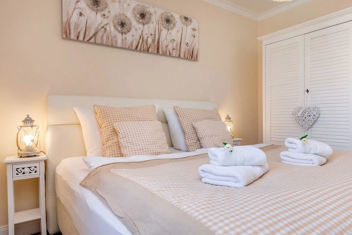 Die Ferienwohnung bietet eine durchdachte Raumaufteilung und hochwertige Ausstattung für einen angenehmen Aufenthalt. Zwei gemütliche Schlafzimmer sind mit bequemen Boxspringbetten (180x200) ausgestattet und verfügen über Flat-TVs sowie Kleiderschränke und Nachttische. Das Badezimmer überzeugt mit bodengleicher Dusche, Badewanne und einem grossen Fenster. Zusätzliche Annehmlichkeiten wie Haartrockner und Kosmetikspiegel sind vorhanden.