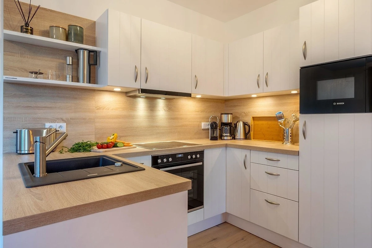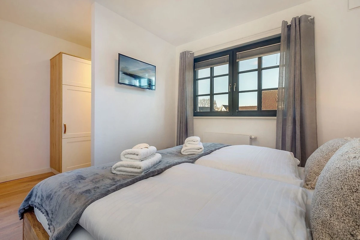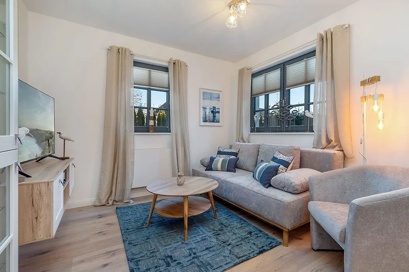 Die Ferienwohnung bietet eine einladende Atmosphäre und ist optimal für einen entspannten Aufenthalt geeignet. Sie verfügt über ein gemütliches Schlafzimmer mit einem komfortablen Doppelbett sowie ein Wohnschlafzimmer mit einer praktischen Schlafcouch. Die offene Küche ist vollständig ausgestattet mit einem Elektro- und Gasherd, einem Geschirrspüler, einem Backofen, einer Mikrowelle und einem Kühlschrank, sowie weiteren Annehmlichkeiten wie einer Kaffeemaschine, einem Wasserkocher und einem Mixer. Das moderne Duschbad ist mit einem Haartrockner ausgestattet. Für Unterhaltung sorgt eine HiFi-Anlage und ein TV. Zusätzlich ist die Wohnung allergikergeeignet und bietet kostenlosen Internetzugang mit WLAN. Ein Parkplatz ist ebenfalls vorhanden. Für die kleinen Gäste gibt es einen Kinderhochstuhl, und die Wohnung ist mit Rauchmeldern und einem Feuerlöscher für die Sicherheit ausgestattet. Hier finden auch Gesellschaftsspiele sowie ein Sonnenschirm Platz, um die Zeit im Freien zu geniessen.