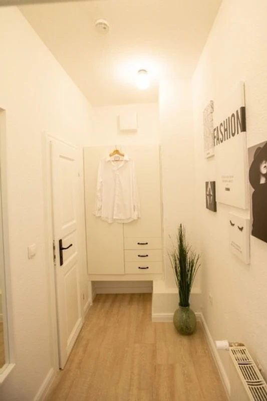 Über den historisch erhaltenen und sanierten Hausflur gelangen Sie über die aufgearbeitete Holztreppe ins 1. Obergeschoss. Hier befinden sich 2 Ferienwohnungen. Durch die grosse Flügeltür gelangen sie in das ca. 35m² grosse Studio mit Altbaucharakter und modernem Flair. Im Flur befinden sich die Garderobe bzw. Ankleide und das neu renovierte Bad mit Dusche, WC und Waschtisch. Durch die historisch erhaltene Tür gelangen Sie in den Wohn-/Ess-/Schlafbereich mit erhaltenem Stuck an den Decken. Es erwartet sie eine moderne Küchenzeile mit allen Geräten für die Zubereitung einer leckeren Mahlzeit. Mikrowelle, 2er Cerankochfeld, Kühlschrank mit Gefrierfach und ausreichend Geschirr sowie Kochutensilien. Das Studio bietet Ihnen Sitz- bzw. Essmöglichkeit für 2 Personen und ein gemütliches 1,80m*2,00m Doppelbett mit komfortablen in Mecklenburg-Vorpommern hergestellten Matratzen. Weiterhin steht Ihnen ein LED-Flachbildfernseher mit Satellitenempfang zur Verfügung. Für Entspannung ist hier also gesorgt.