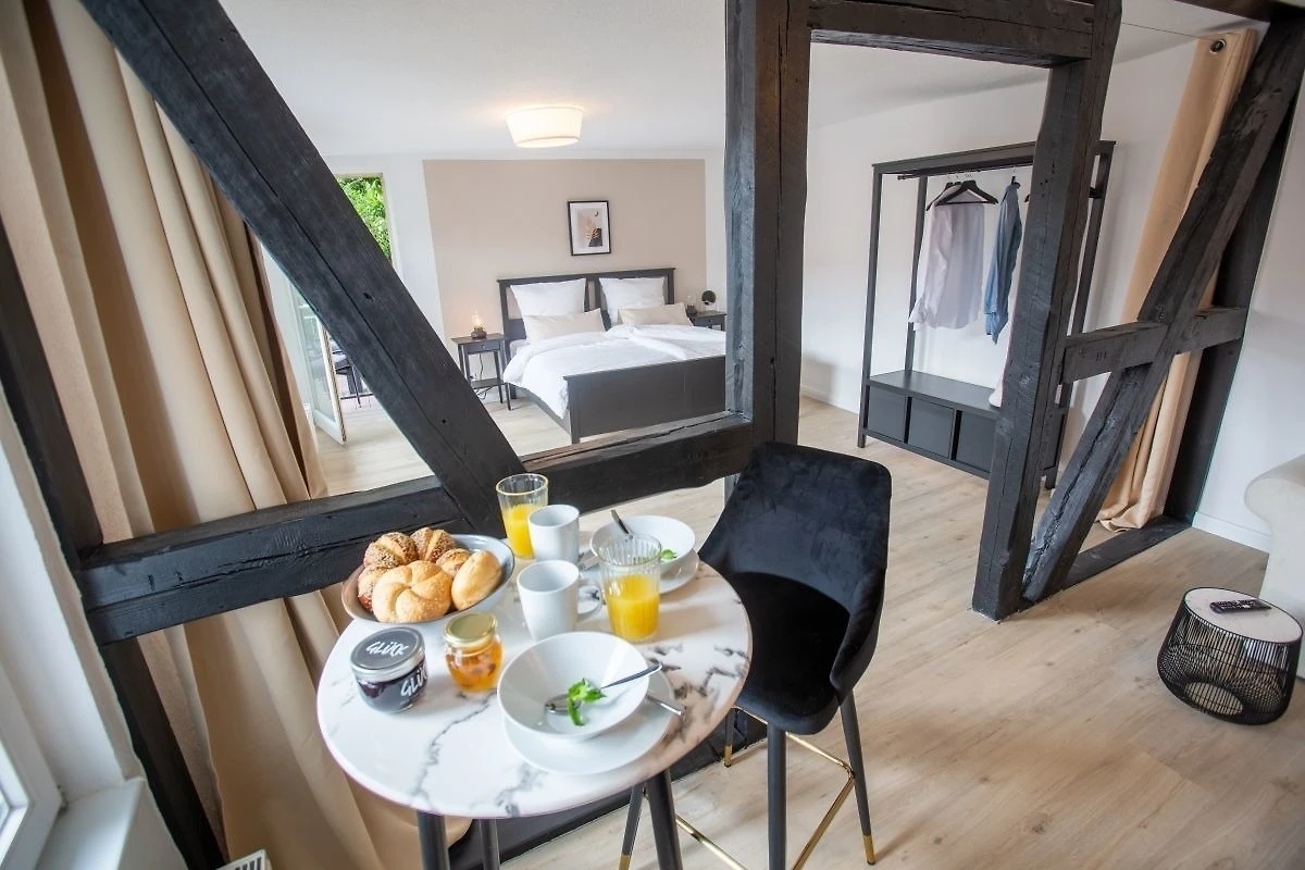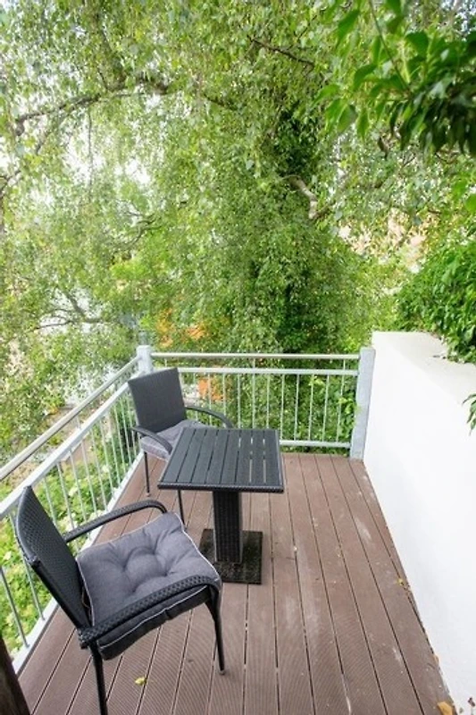 Durch historische Balken und Verdunklungsvorhänge ist der gemütliche Schlafbereich vom Wohnbereich abgegrenzt. Hier befinden sich ein 1,80m*2,00m Doppelbett mit komfortablen in Mecklenburg-Vorpommern hergestellten Matratzen, sowie ein offener Kleiderschrank. Für gemeinsame Stunden zu zweit nehmen Sie auf dem Balkon platz und geniessen einen lauen Sommerabend bei einem Glas Wein oder kühlem Bier mit Ausblick auf die Nikolaikirche.