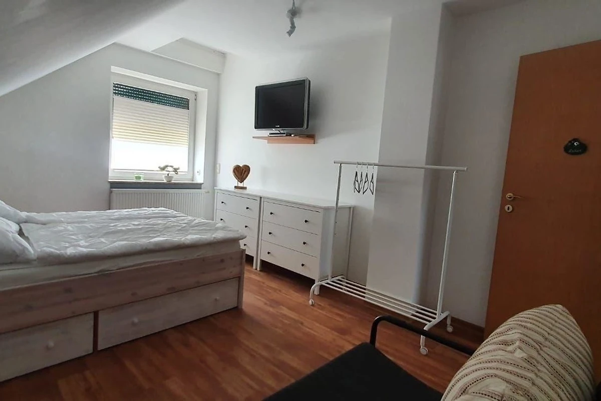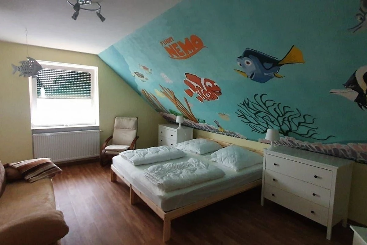 Zwei Schlafzimmer mit je ein Doppelbett (je eine Aufbettung möglich). TV in jedem Zimmer. Freies WLAN im ganzen Objekt.