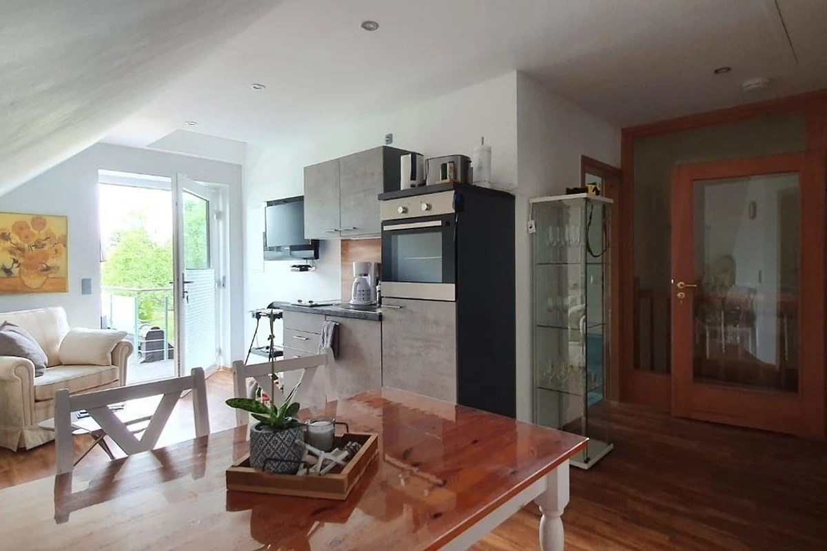 Im Wohn-und Essbereich gibt es eine Küche, ausgestattet mit Kühlschrank+ Gefrierfach, Geschirrspüler und Ceran-Kochfeld. Essecke, Couch+ Sessel und TV .
