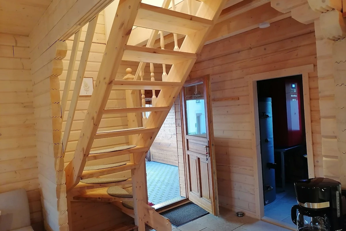 Pellet- Fussbodenheizung. Gemütliche Holzhausatmosphäre.
