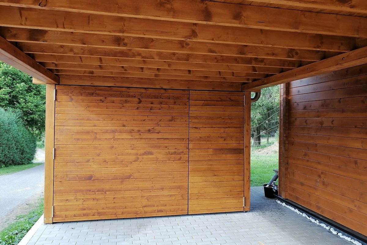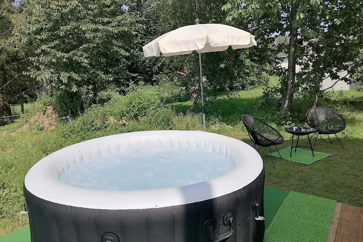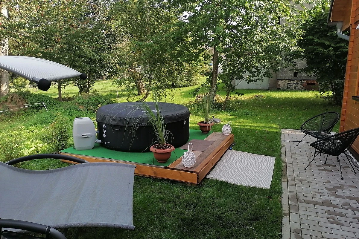 Terrasse mit Garten und Kleinkinderspielutensilien. Whirlpool hinter dem Haus. Carport mit Schuppen.
