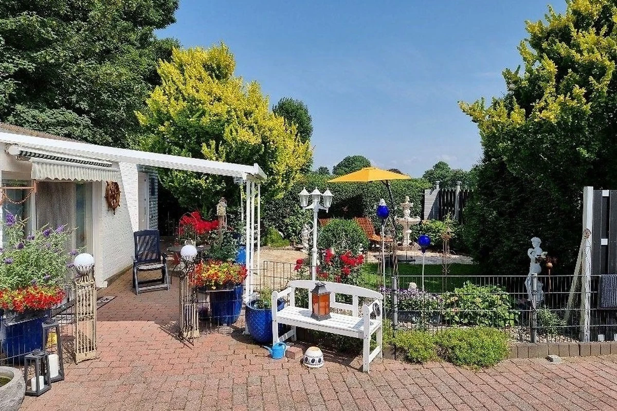Der Garten ist mit zwei Terrassen, Liege- und Sitzbereich 2020 neu angelegt worden und mit Sichtschutzelementen ausgestattet. Über der Eingangsterrasse befindet sich eine transparente Überdachung mit Sonnenschutz. Eine Sonnenterrasse mit tiefen Stühlen und einem grossen Sonnenschirm, lädt zum Chillen ein. Zwei klassische Wasserbrunnen runden das dezente Ambiente ab. Nachts sind die verschiedenen Gartenbereiche mit einer dreiflammigen Laterne und verschiedenen LED Lichtern zeitweise beleuchtet.