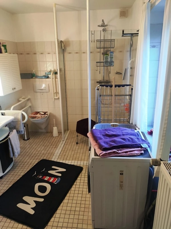 An das gut ausgestattete Schlafzimmer schließt sich ein großes behindertengerechtes Badezimmer mit Dusche und Haltegriffen an . Daneben sind eine Waschmaschine, Toilette und Dusche, ebenfalls mit Haltegriffen. Die Duschöffnung ist so groß, dass ein Rollstuhl hindurch passt. Im ganzen Haus sind genügend Staumöglichkeiten und alle Türen sind extrabreit ausgelegt, um mit einem Rollstuhl überall hindurchzukommen. Im ganzen Haus sind elektrische Rollläden installiert. Auf Wunsch kann ein Bettgalgen aufgestellt werden!
