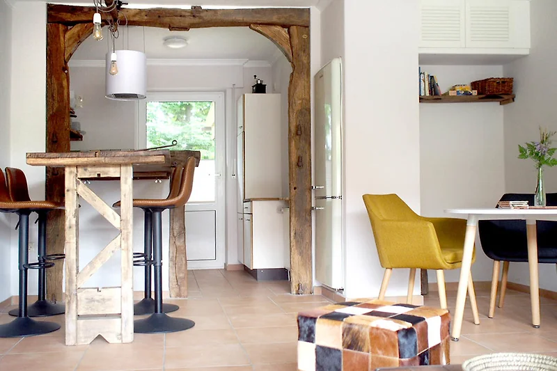 Highlight im angrenzenden grossen hellen Wohnraum ist der Torbogen aus antiken Scheunenbalken, der den Wanddurchbruch zwischen Wohn-/Esszimmer und Küche ziert und einen Blick auf den Garten freigibt.