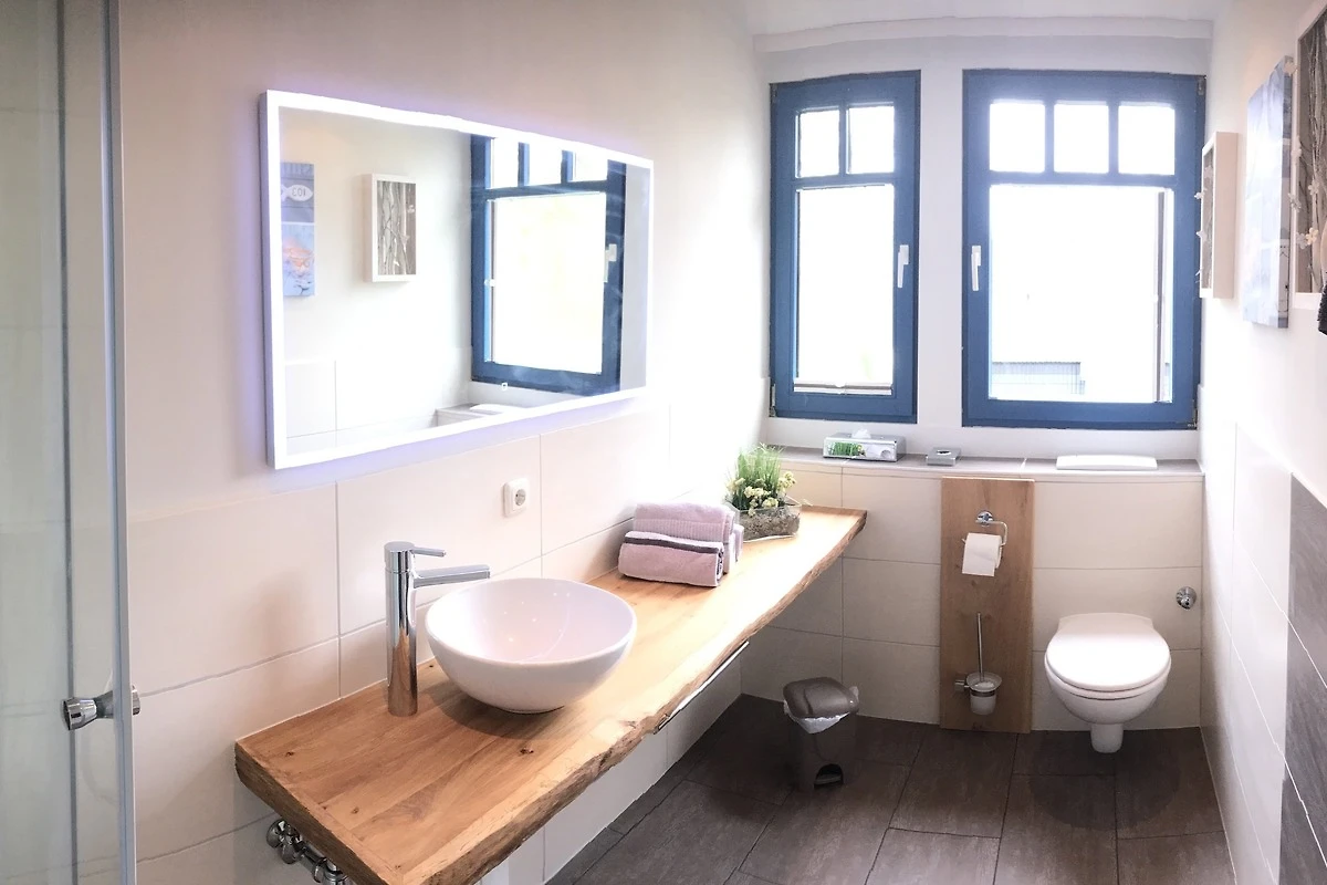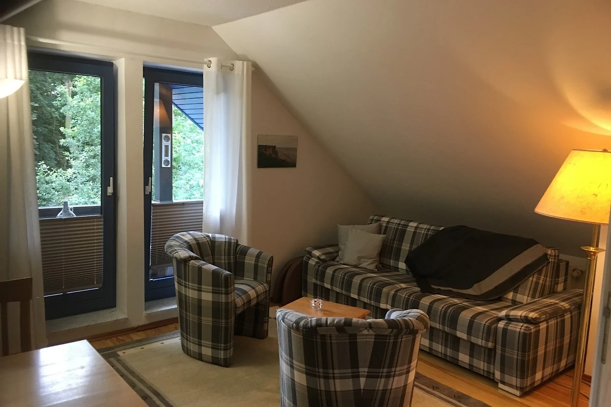 Unsere grösste Zweizimmer-Ferienwohnung im Dachgeschoss mit Blick zur See- und Waldseite verfügt über 53 m². Zur Südseite am Wohnzimmer hin hat sie einen sonnigen Balkon der zum Frühstücken oder Abendessen einlädt. Das Schlafzimmer zur Seeseite mit grossem Doppelbett und begehbarem Kleiderschrank ermöglicht einen erholsamen Schlaf bei Meeresrauschen. Das Wohnzimmer mit sehr hochwertiger ausziehbarer Schlafcouch ( eingebaute Matratze mit Lattenrost) , Satelliten-TV, kostenlosem WLAN- Anschluss, kleiner Audio-Kompaktanlage, abgegrenztem komplett eingerichteten Küchenbereich und Essecke runden Ihre wohlfühl Ferienwohnung ab. Ein Duschbad und die Diele mit zwei Einbauschränken gehören ebenfalls zur Wohnung.