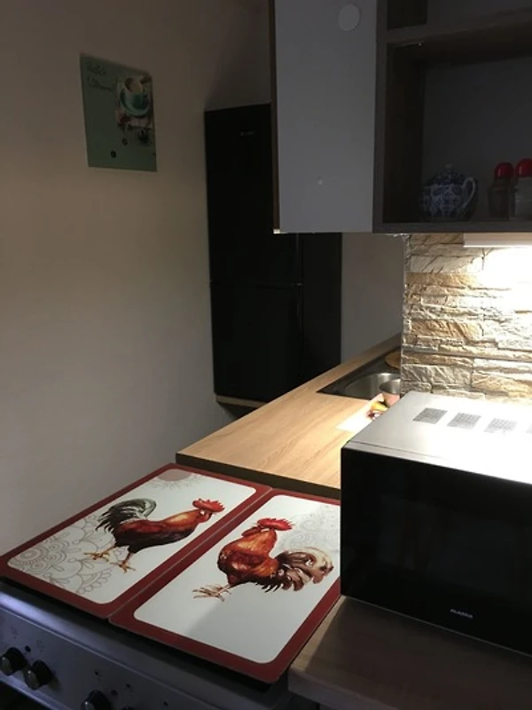 Im Wohnbereich steht eine Schlafcouch und digitaler Sat-TV bietet Ihnen Unterhaltung. Angrenzend an den Wohnbereich ist eine Küchenzeile mit 4 Kochplatten, Kühlschrank, Kaffeemaschine, Wasserkocher und Toaster.