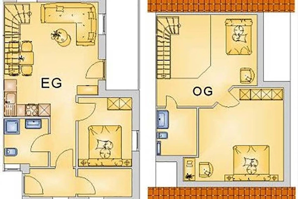 Im EG: Wohnschlafraum mit Doppelbettcouch, Farb-TV, Essplatz für 6 Personen Küchenzeile mit E-Herd (Geschirrspüler, Backrohr, Mikrowelle, Toaster und Kaffeemaschine),