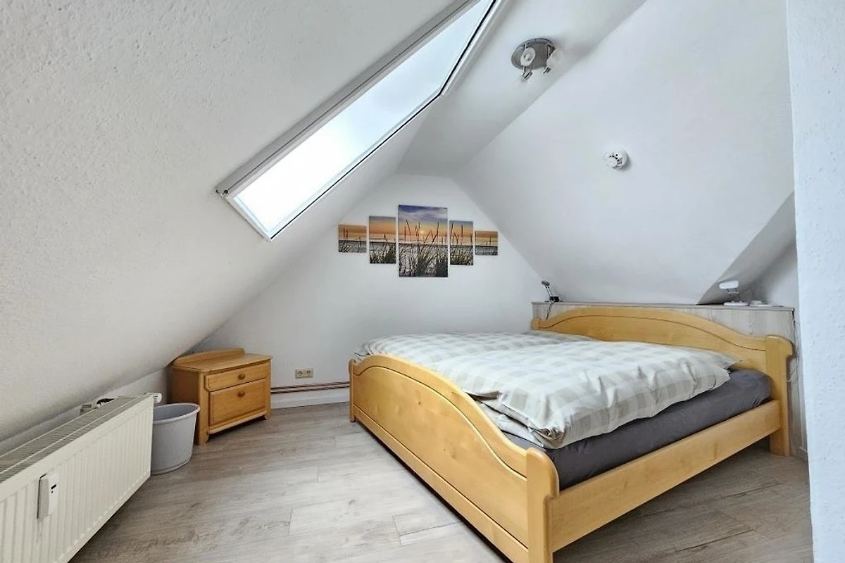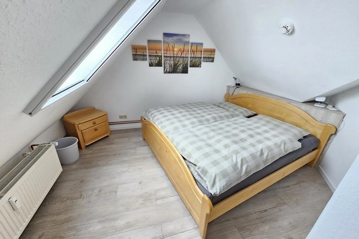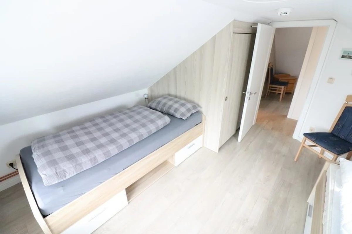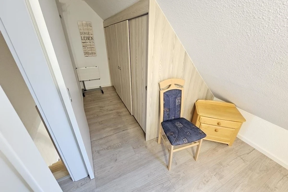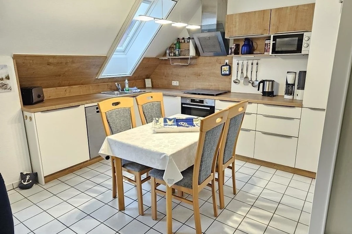 Es stehen Ihnen 2 Schlafräume im Dachgeschoss zur Verfügung (1 Doppelbett und 2 Einzelbetten). 1 Wohnraum mit gemütlichem Sofa und Essplatz und TV. Die Küchenzeile ist mit einem Kühlschrank, einem Backofen, einem Ceranfeld und einem Geschirrspüler ausgestattet. 1 Badezimmer mit Dusche / WC.