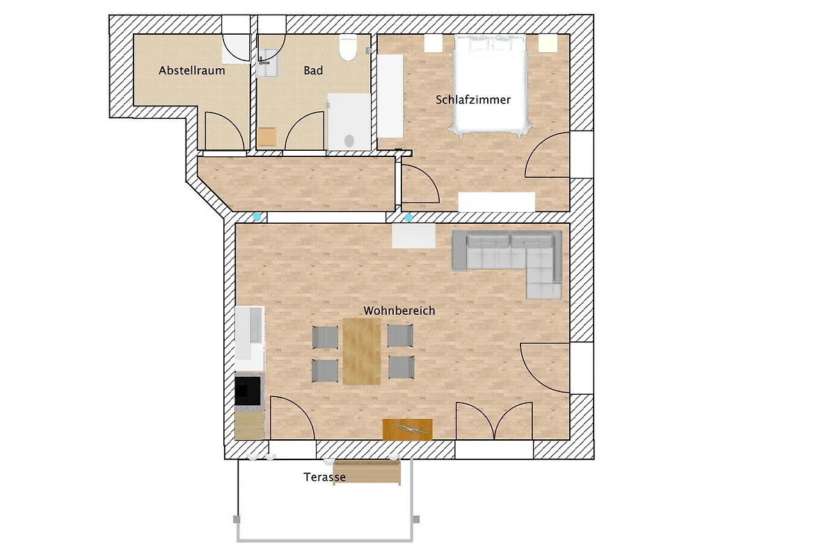 Die neu gestaltete, lichtdurchflutete und gemütlich eingerichtete Ferienwohnung mit 62m² für 2-4 Personen liegt im Hochparterre unseres Mehrfamilienwohnhauses. Sie beinhaltet eine Wohnküche mit Schlafsofa, ein separates Schlafzimmer mit Doppelbett, TV-Gerät sowie ein Badezimmer. Sämtliche Räume werden mit Fussbodenheizung beheizt. Die Wohnküche ist komplett eingerichtet (Kühlschrank inkl. Gefrierfach, Backofen, Ceran-Kochfeld, Spülmaschine, Krups Del-Gusto Kaffeemaschine, Toaster, Wasserkocher) und verfügt über einen Esstisch mit 4 Sitzplätzen.
