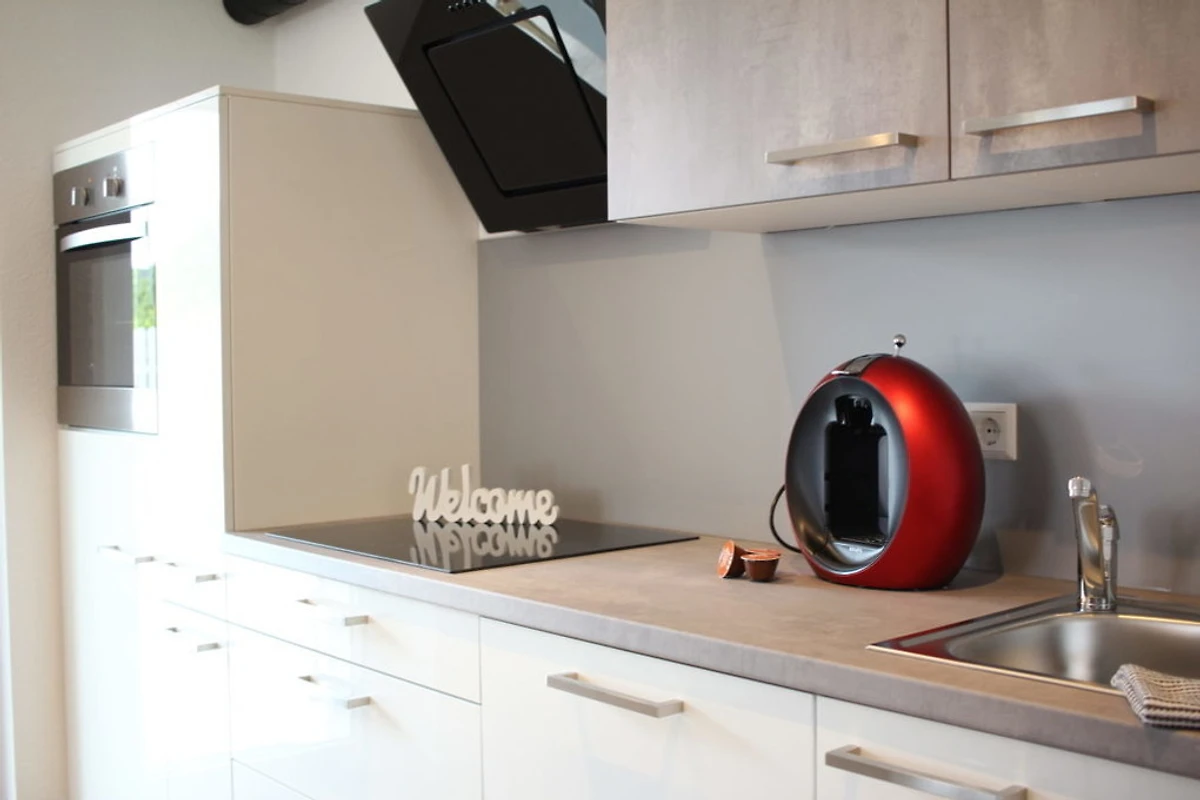 Hier finden Sie: Kühlschrank inkl. Gefrierfach, Backofen, Ceran-Kochfeld, Spülmaschine, Krups Del-Gusto Kaffeemaschine, Toaster und Wasserkocher