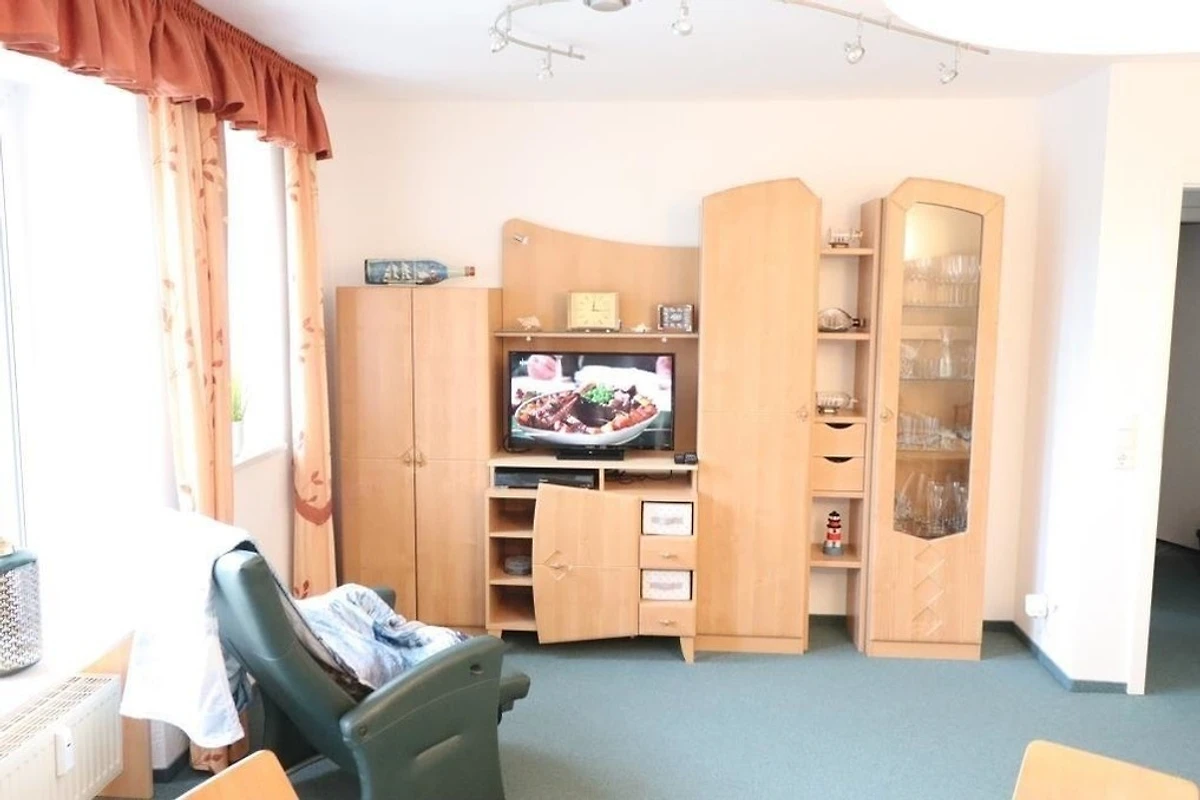Gemütliche Ferienwohnung mit einem Schlafraum mit einem Doppelbett (davon 1 Bett mit verstellbarem Lattenrost), ein Wohnraum mit Küchenzeile mit Backofen, Mikrowelle und Kühlschrank, Bad / WC, TV