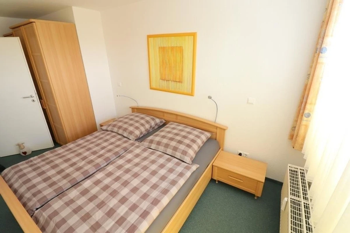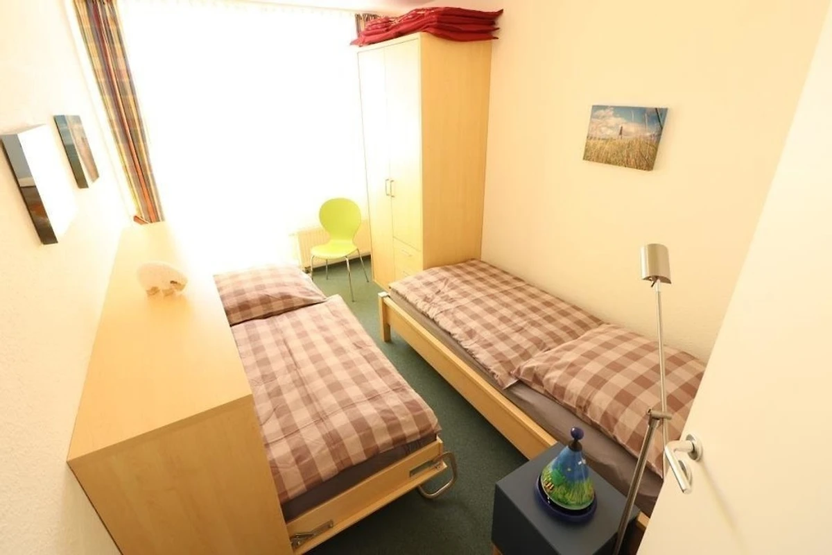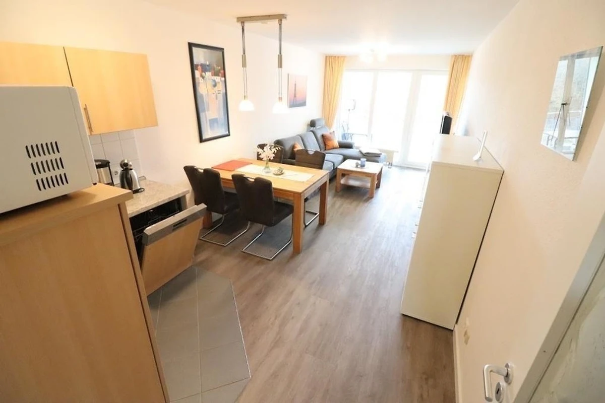 Schöne Ferienwohnung im Haus Nordseebrandung mit einem Schlafraum mit einem Doppelbett, einem Schlafraum mit einem Einzelbett und einem Einzelschrankbett, ein Wohnraum, Küchenzeile mit Mikrowelle, Backofen, Geschirrspüler und Kühlschrank, Dusche / WC, TV