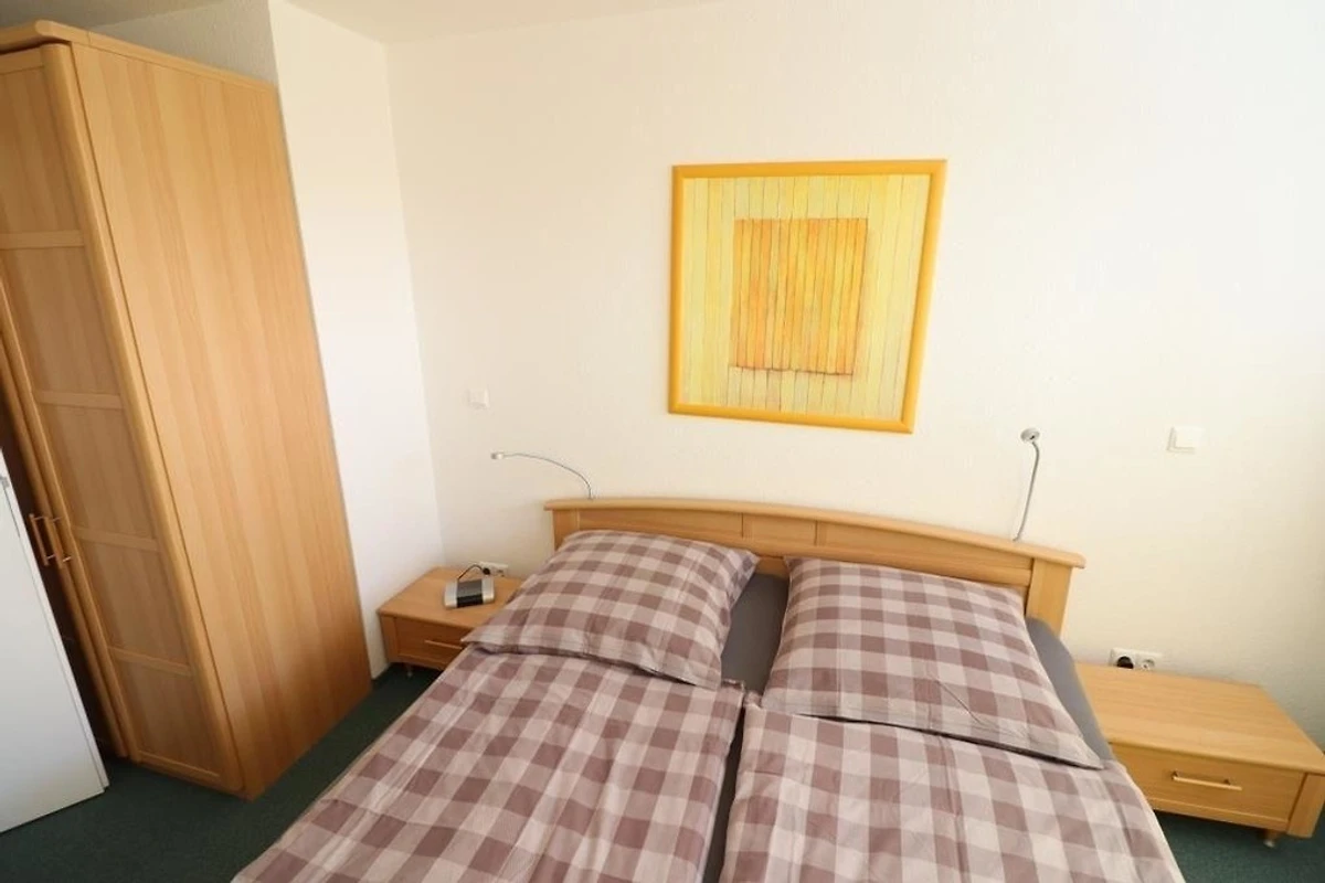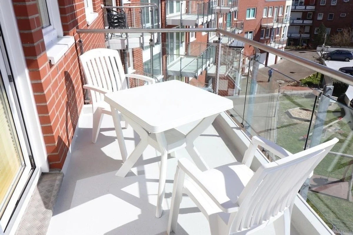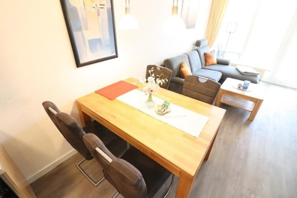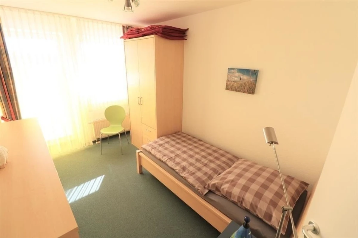 Schöne Ferienwohnung im Haus Nordseebrandung mit einem Schlafraum mit einem Doppelbett, einem Schlafraum mit einem Einzelbett und einem Einzelschrankbett, ein Wohnraum, Küchenzeile mit Mikrowelle, Backofen, Geschirrspüler und Kühlschrank, Dusche / WC, TV
