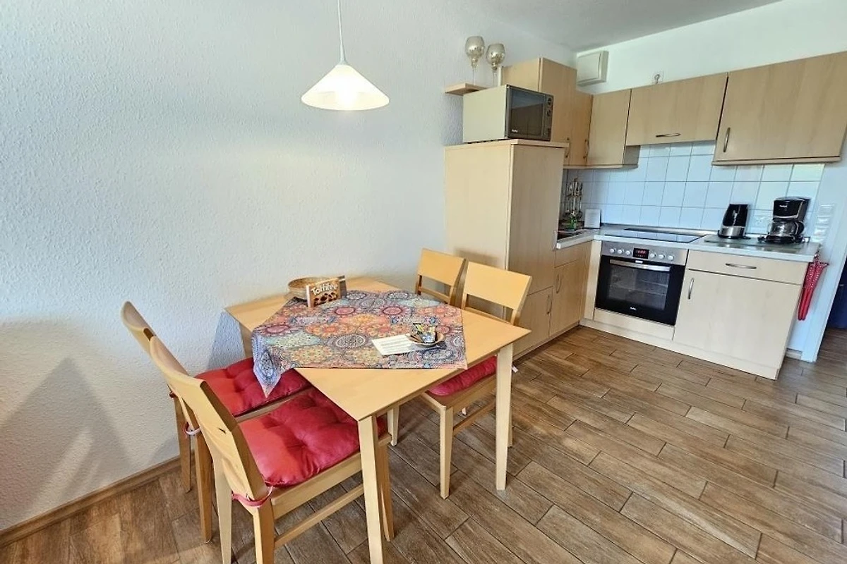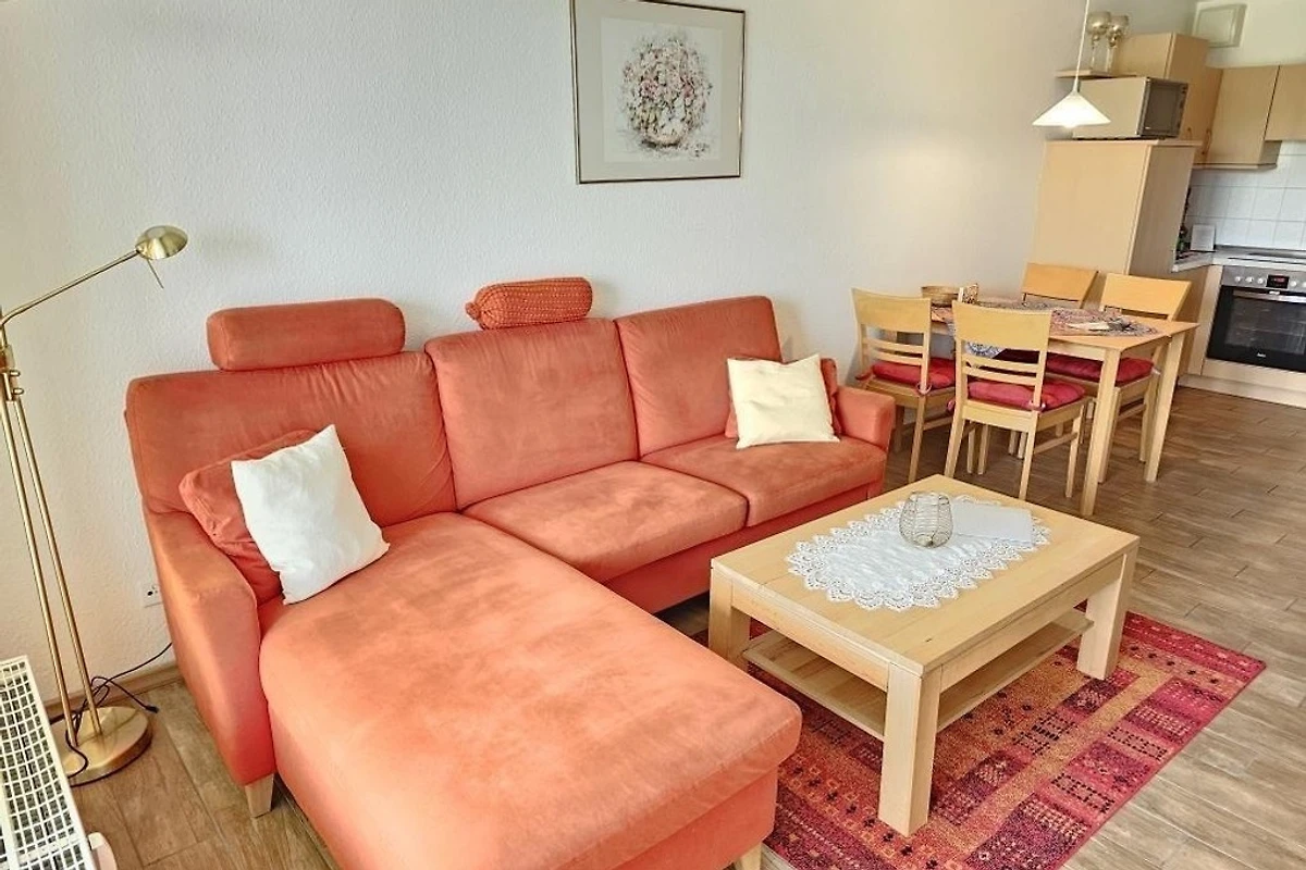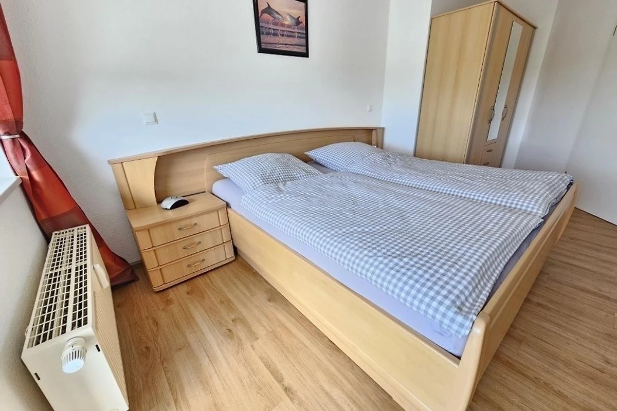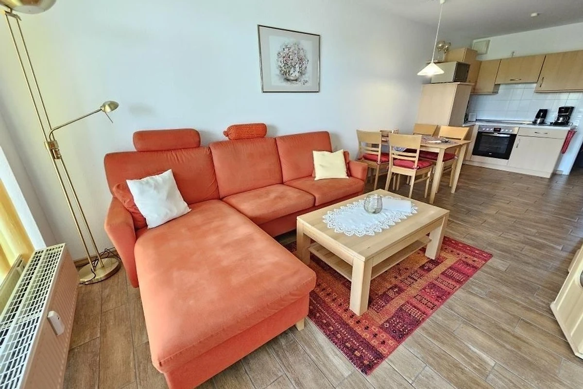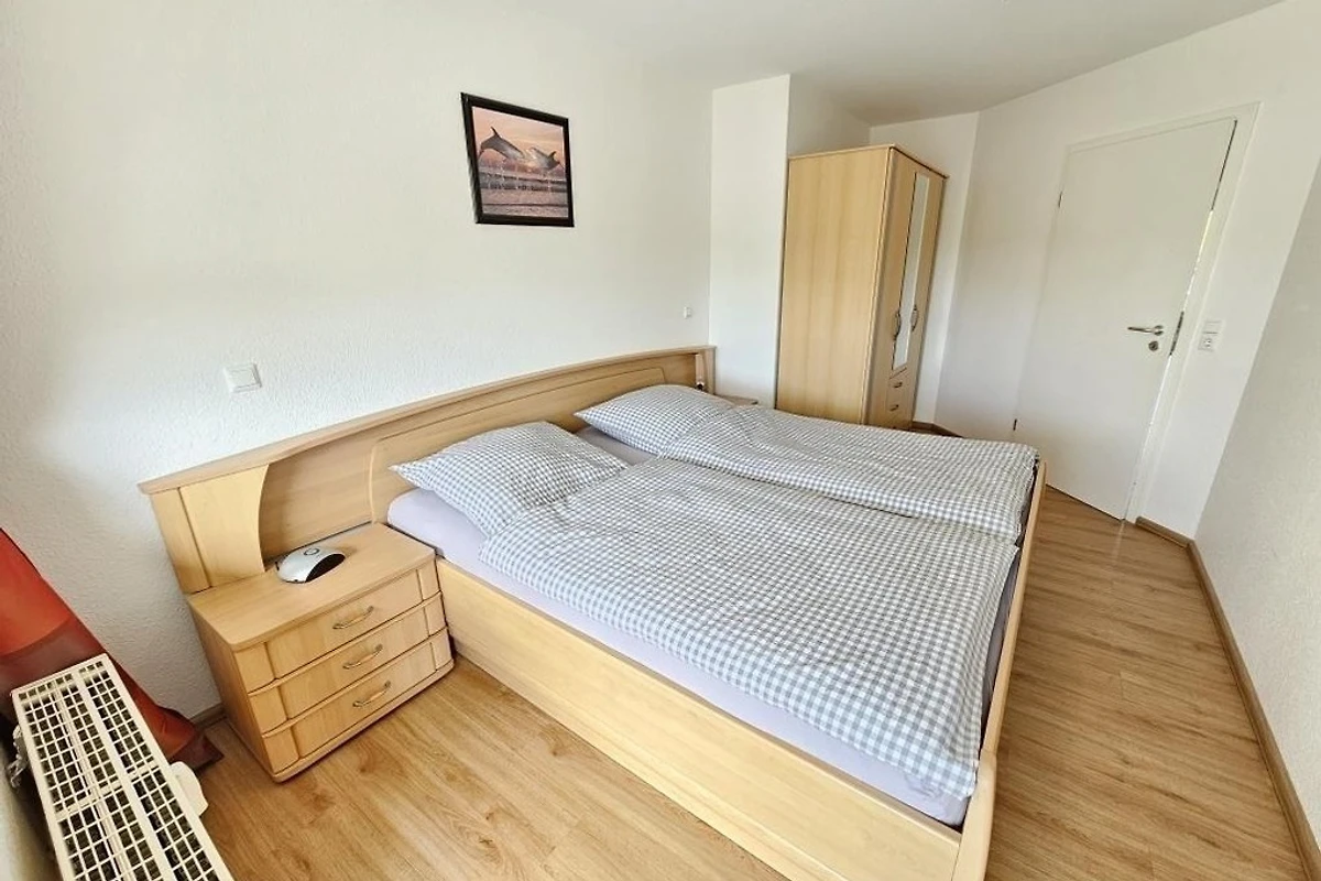 Gemütliche Ferienwohnung im Haus Nordseebrandung mit einem Schlafraum mit einem Doppelbett, einem Schlafraum mit einem Etagenbett, ein Wohnraum, Küchenzeile mit Mikrowelle, Backofen und Kühlschrank, Dusche / WC, Radio-CD, TV