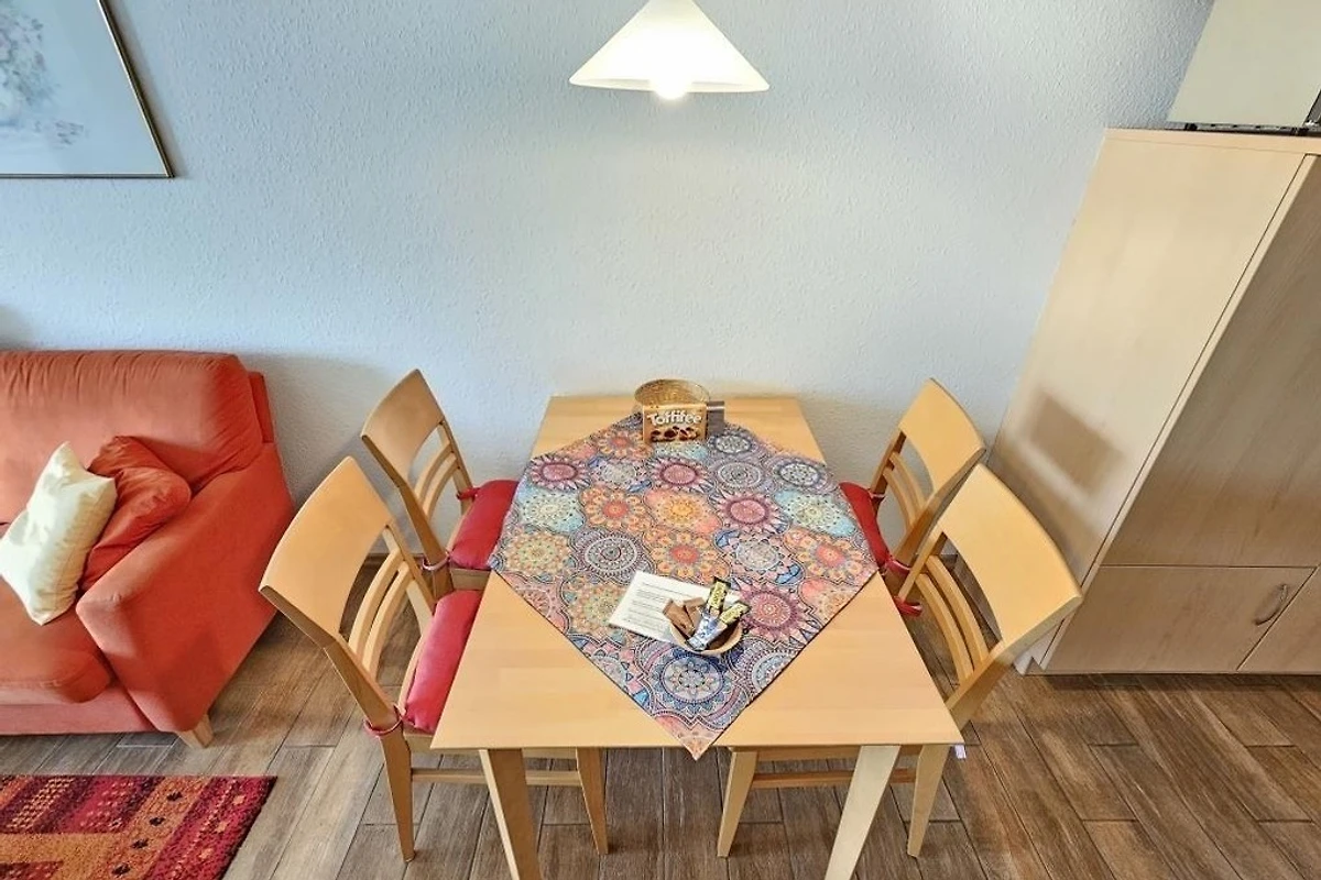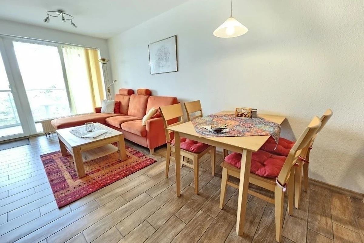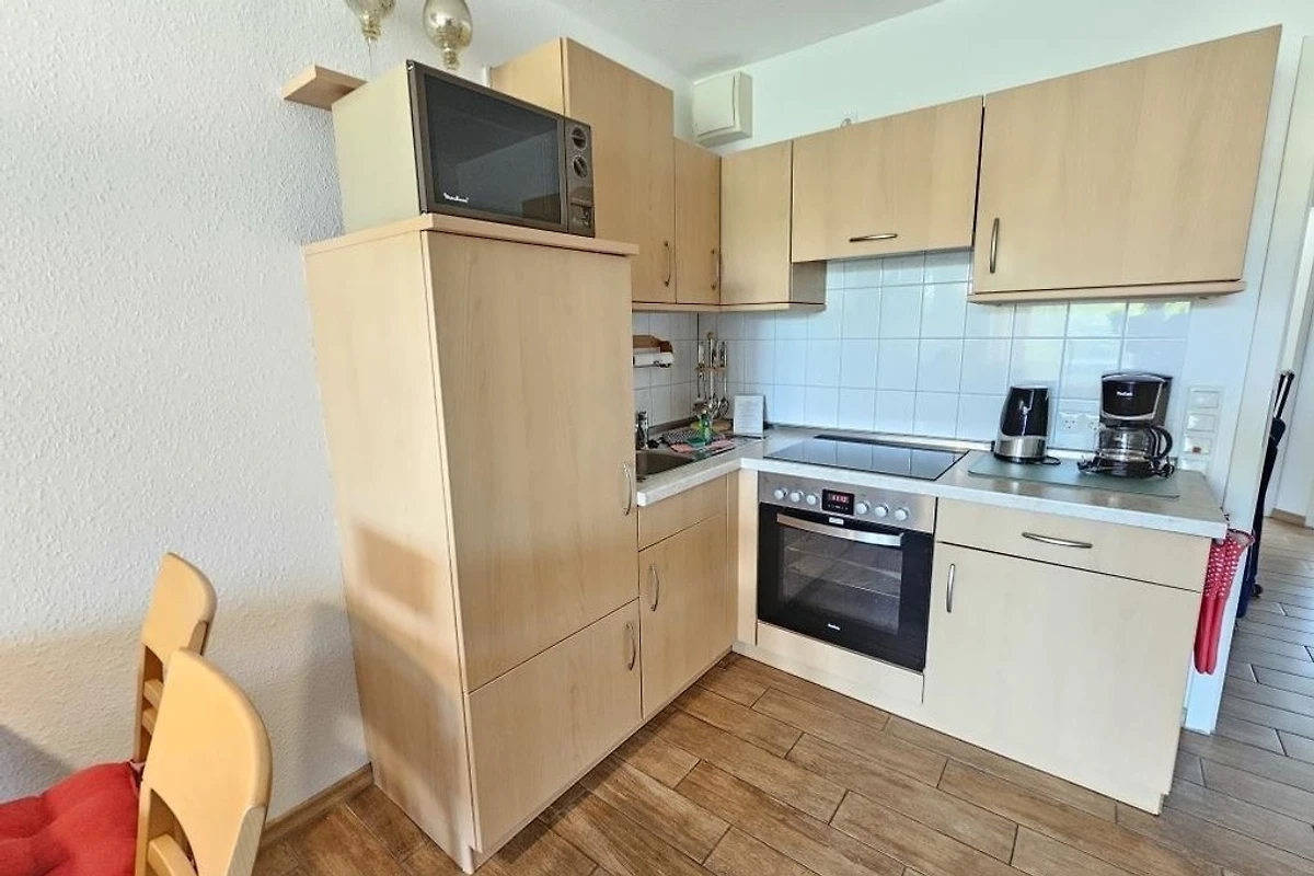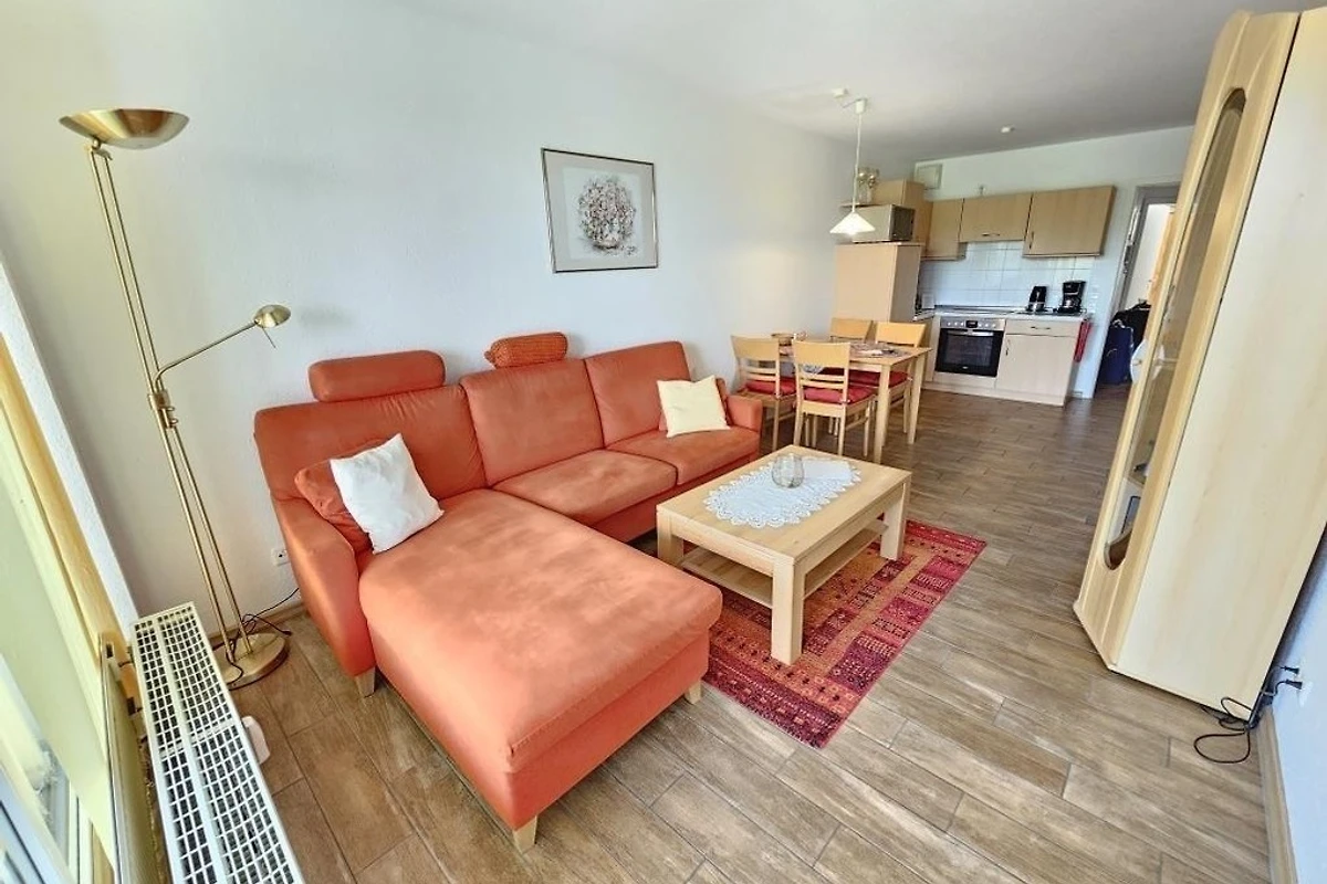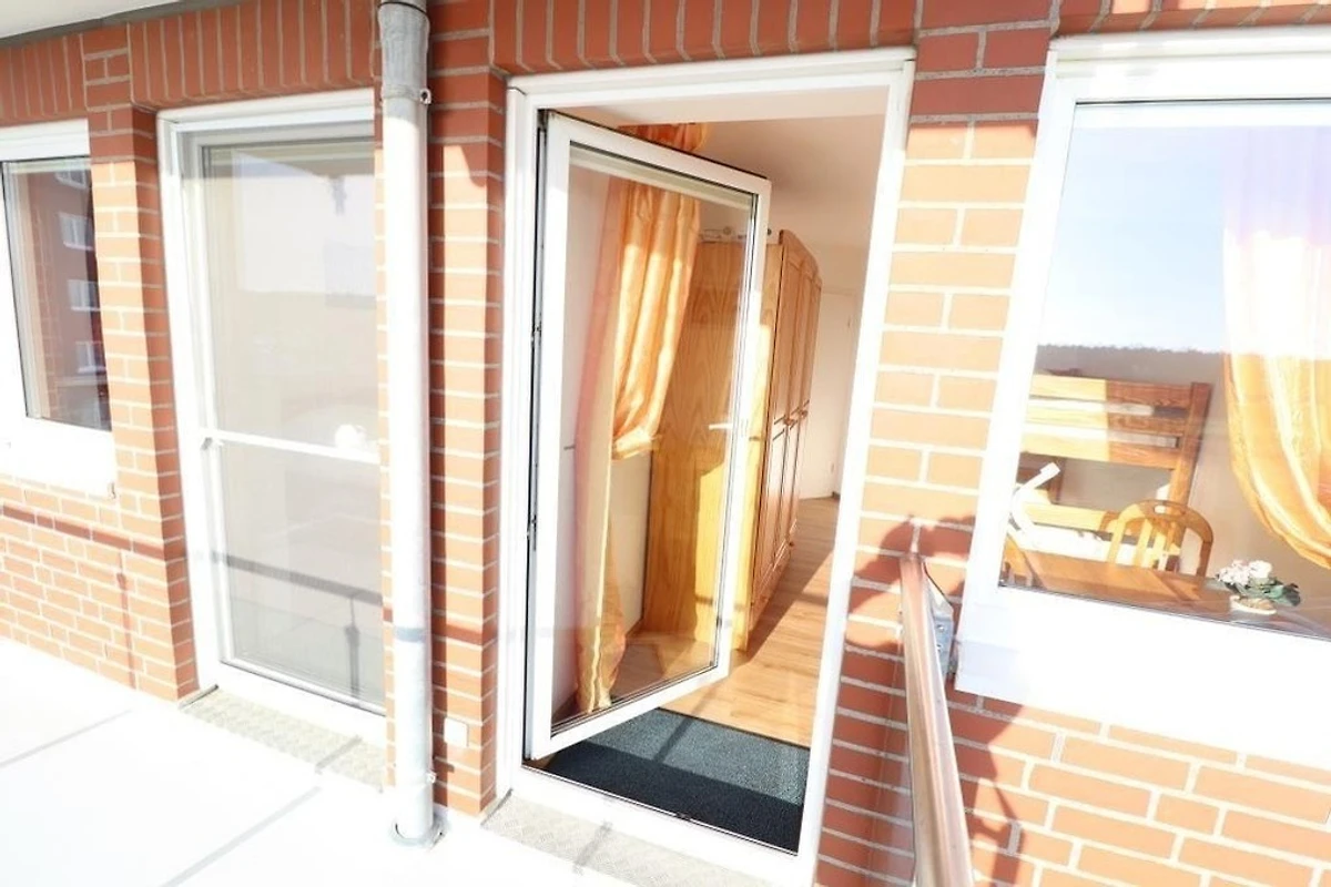 Gemütliche Ferienwohnung im Haus Nordseebrandung mit einem Schlafraum mit einem Doppelbett, einem Schlafraum mit einem Etagenbett, ein Wohnraum, Küchenzeile mit Mikrowelle, Backofen und Kühlschrank, Dusche / WC, Radio-CD, TV