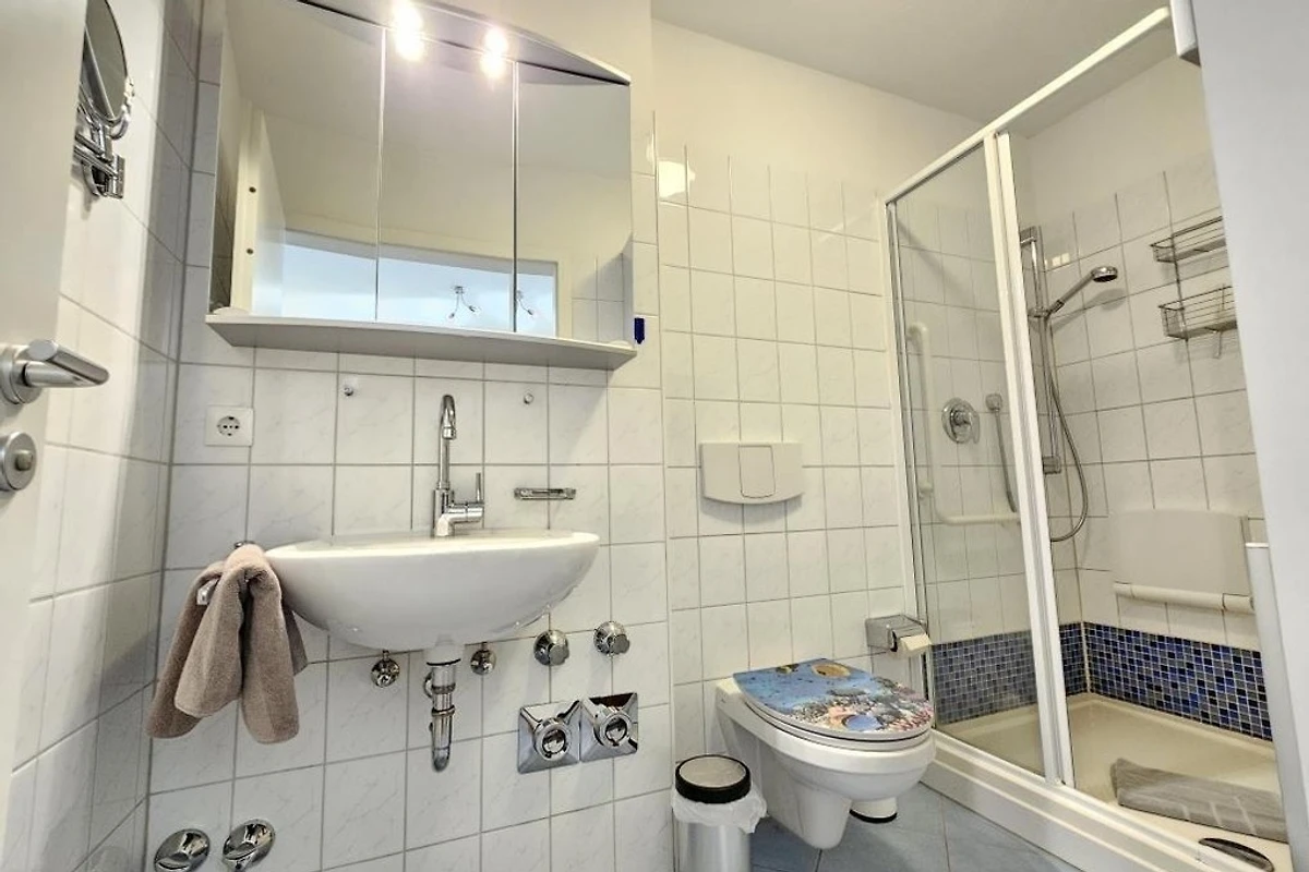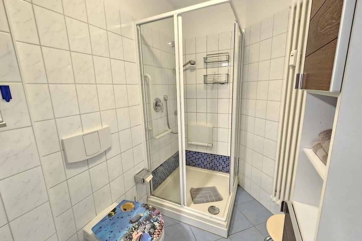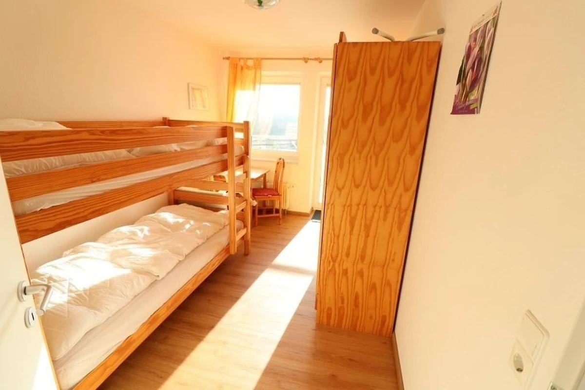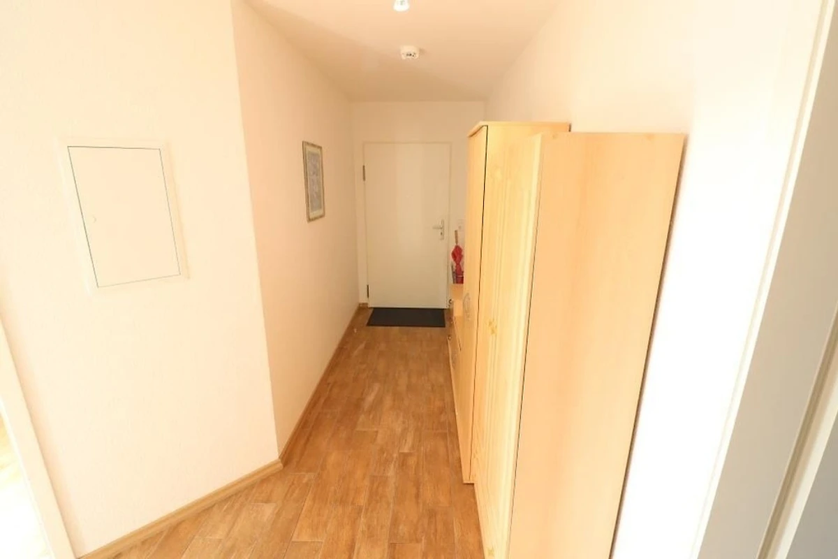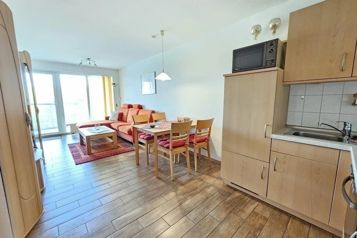 Gemütliche Ferienwohnung im Haus Nordseebrandung mit einem Schlafraum mit einem Doppelbett, einem Schlafraum mit einem Etagenbett, ein Wohnraum, Küchenzeile mit Mikrowelle, Backofen und Kühlschrank, Dusche / WC, Radio-CD, TV