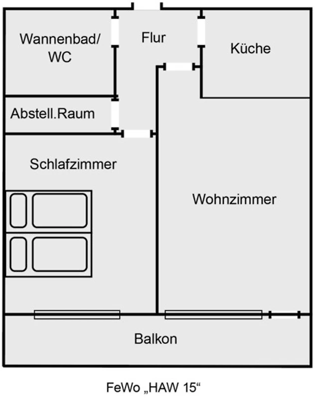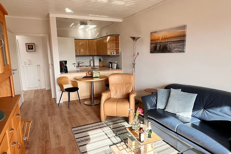 Auf einer Wohnfläche von 50qm stehen Ihnen ein Wohzimmer mit Essecke, eine zum Wohnraum offene Küche, ein separates Schlafzimmer mit bequemen Doppelbetten sowie ein Wannenbad/WC zur Verfügung.