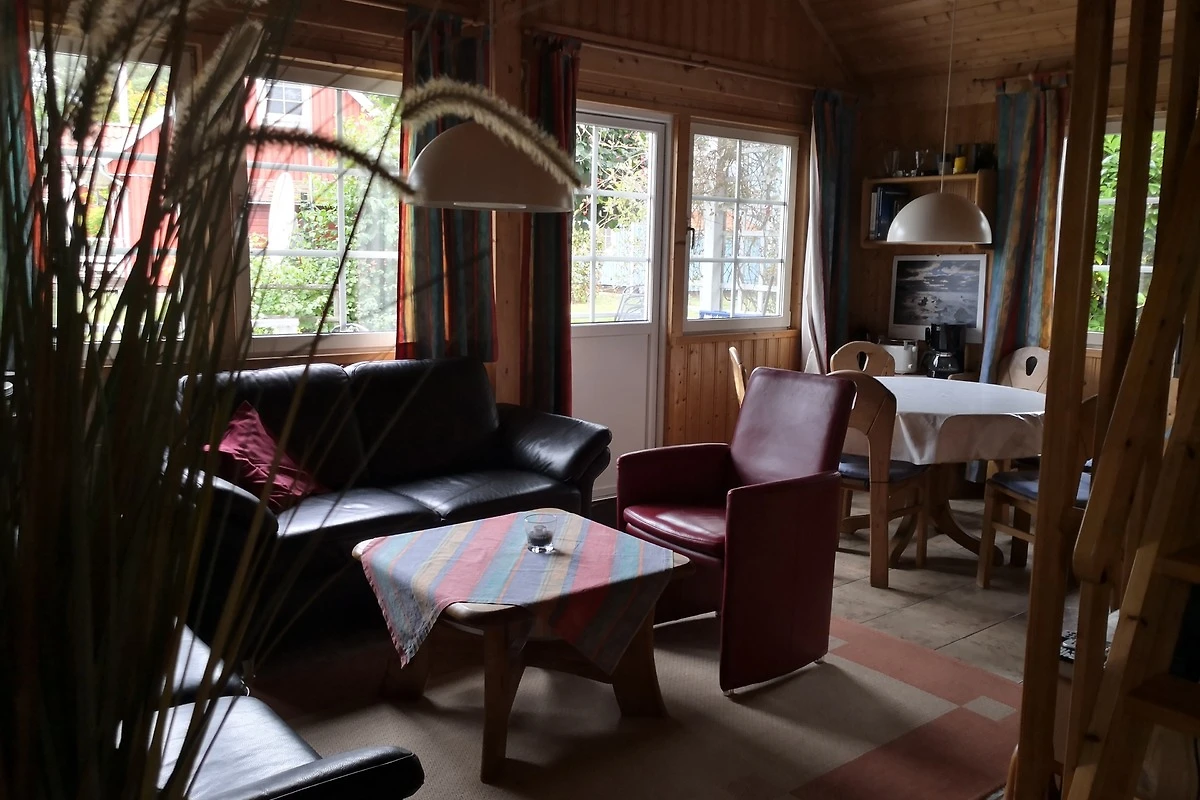 Der Wohn-/Aufenthaltsraum mit Flachbildschirm-TV/Sat und Radio lädt mit zwei bequemen Ledersofas und einem Sessel rund um einen Speckstein-Kaminofen zum Lesen und Entspannen ein. Von dort treten Sie direkt auf Ihre Terrasse und die dahinter liegende offene Rasenfläche. Sonnenschirm und Terrassenmöbel samt Sitzpolstern sind vorhanden.