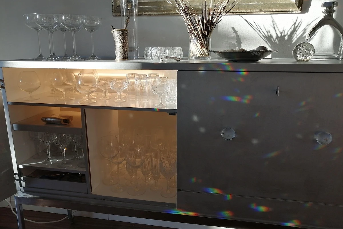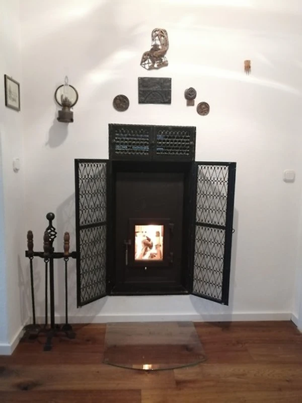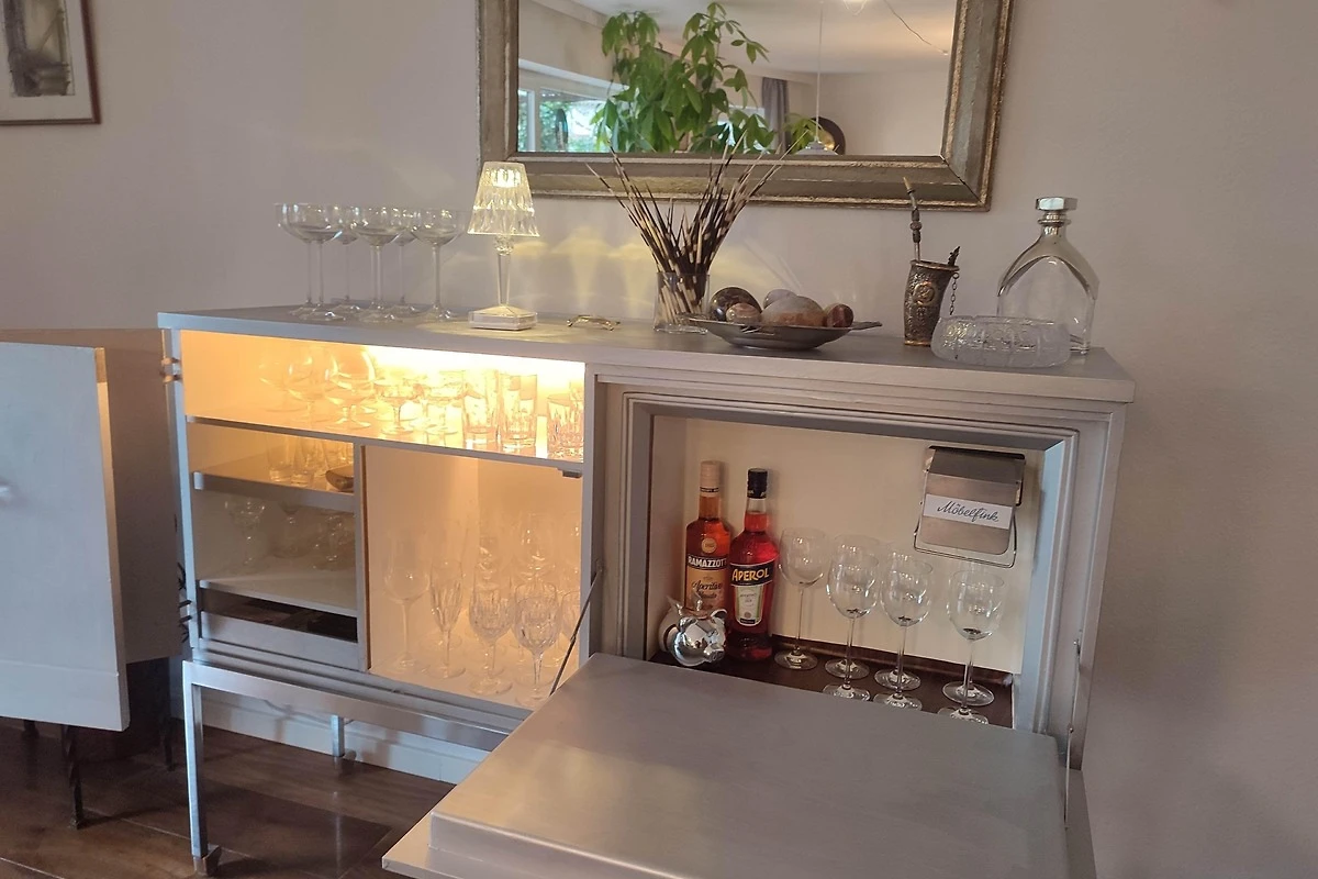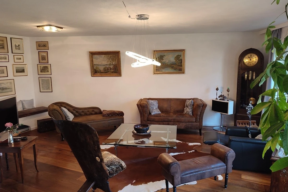 Ein Kachelofen mit Fenster zum Flur sorgt für eine romantische Stimmung. Edle Vintagemöbel und 100 a alte Ölgemälde vom Starnberger See wie auch 100 a alte Antiquitäten neben neuen Designermöbeln und echten und neuen Schaf- und Kuhfellen ermöglichen stilvolles Wohnen. Ein Massagesessel mit Liegefunktion und Heizung ermöglichst herrliche Entspannung. Die bluetoothfähige Stereoanlage kann mit dem Smartphone verbunden werden.