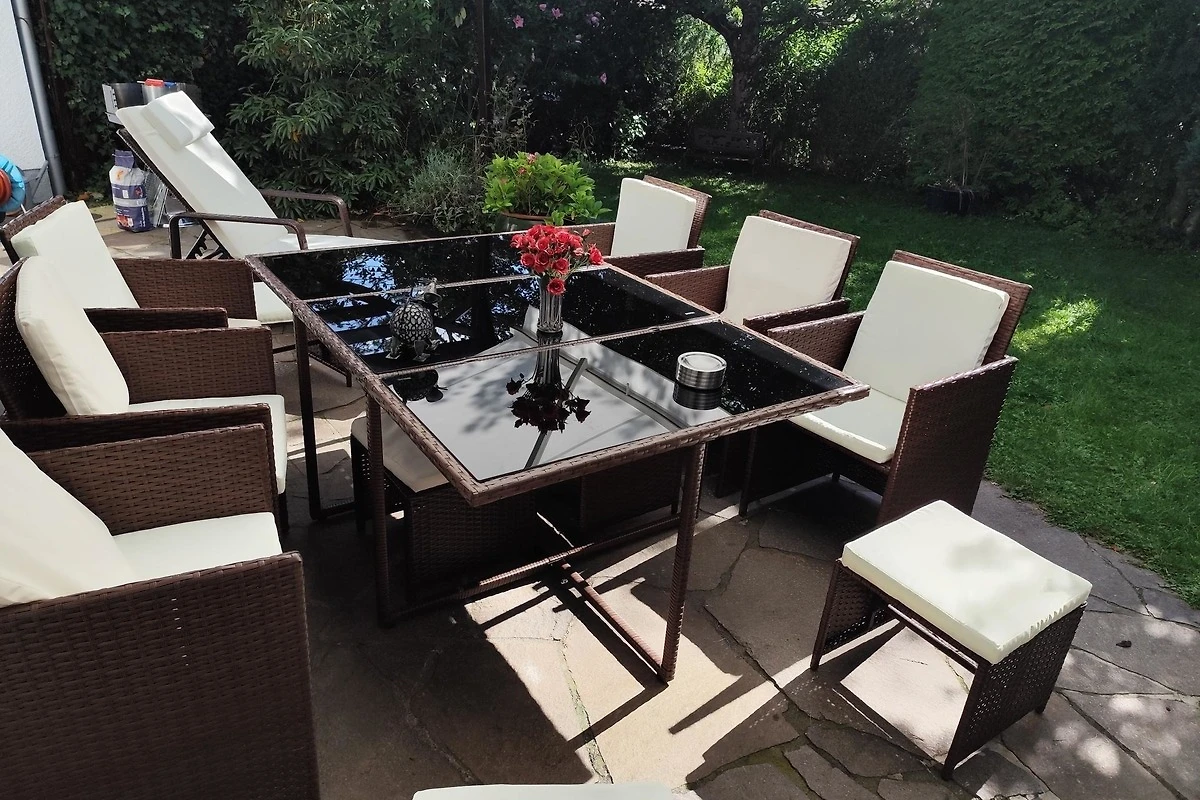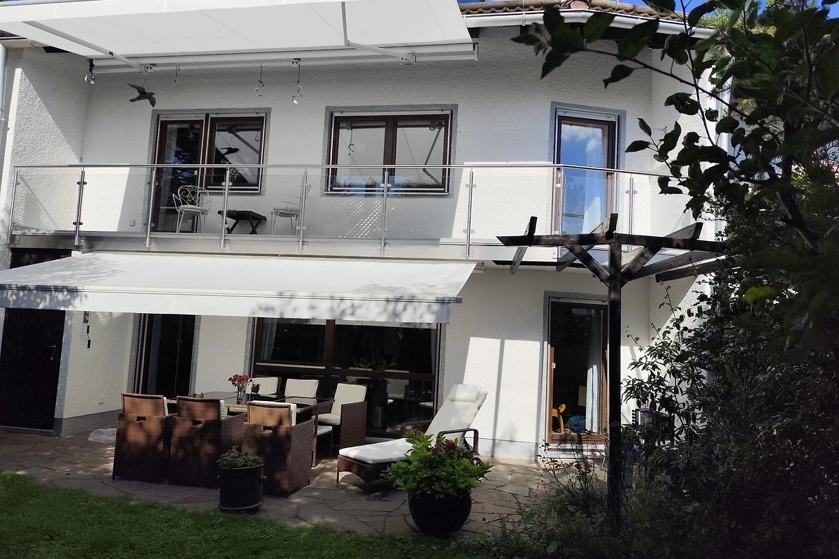 Ruhiger, herrlich grüner und uneinsehbarer Garten (140 qm) am Waldrand, edler Balkon mit Naturstein, Edelstahl und Glas, elegantes, neues Edelstahlmülltonnenhäuschen, viele Stellplätze und Kinderspielplatz, hochwertige Tischtennisplatte , 5 - 6 sportliche Fahrräder (darunter ein neues E-Bike) mit 27 - 21 Gängen, ein Jugend-Einrad und grosse Einzelgarage mit elektrischem Tor, sehr grosse, teilweise überdachte Terrasse, überdachter Balkon, beides mit herrlich weisser, neuer Markise für eine optimale Verschattung, abschliessbares Gartentor.