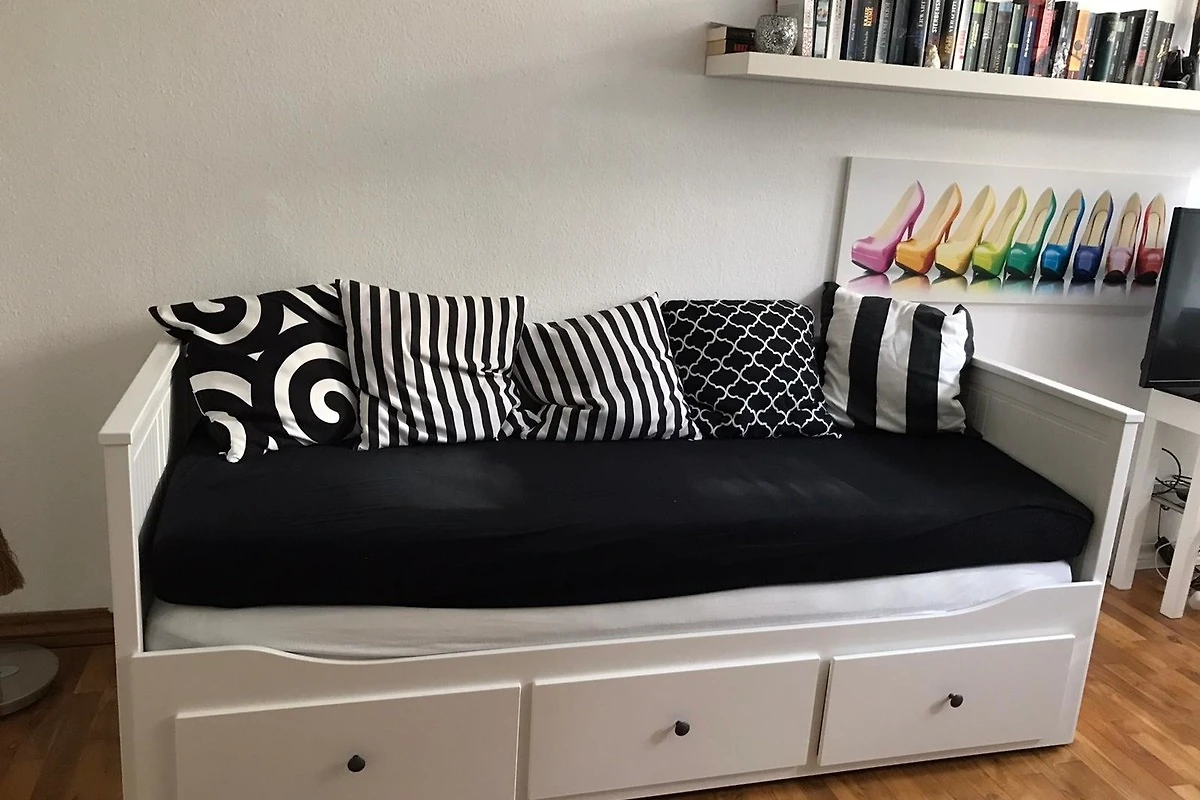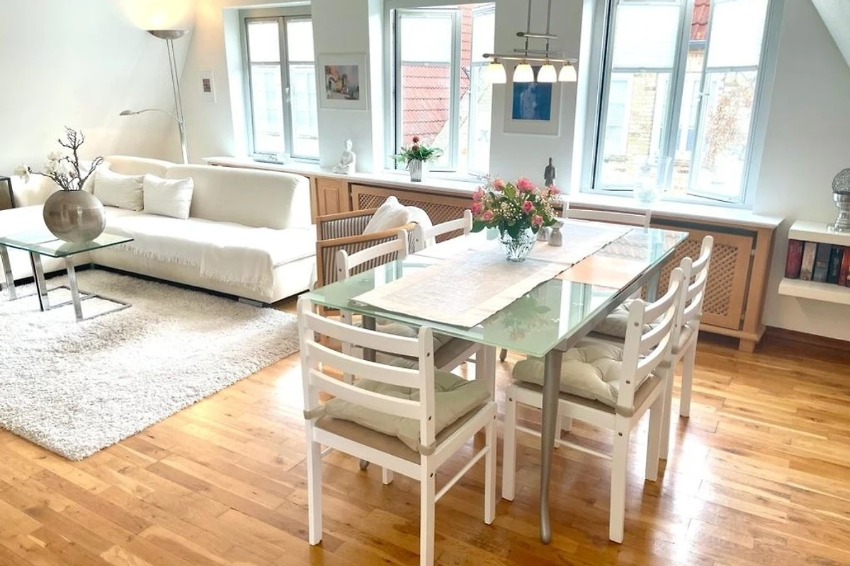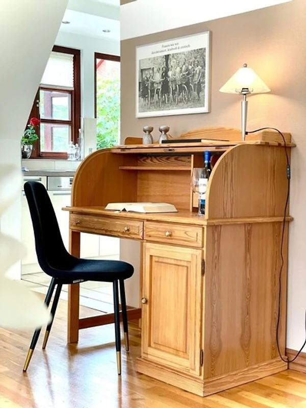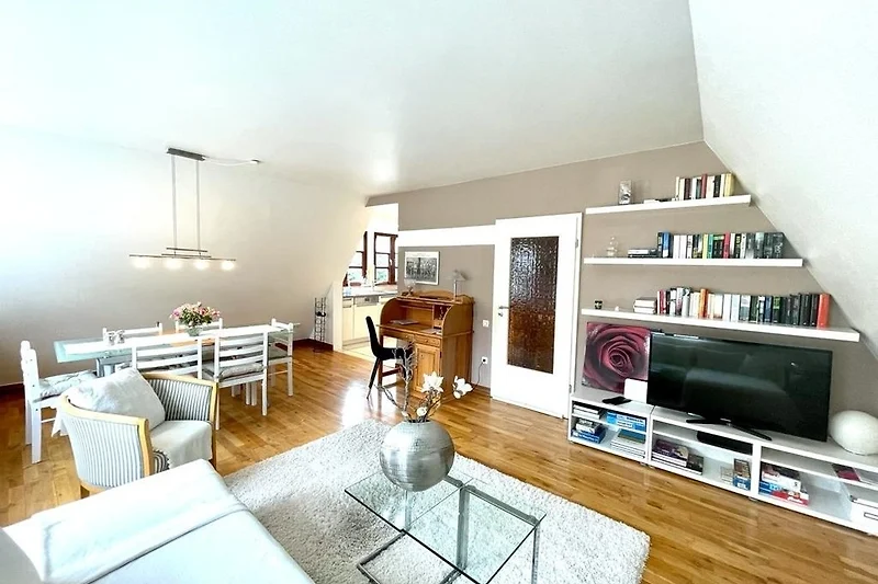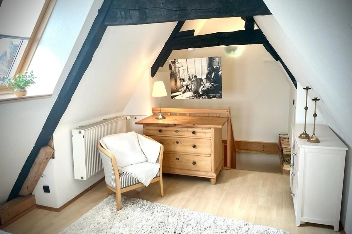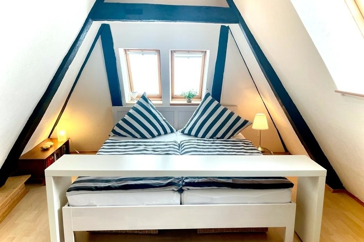 Über die offene Holztreppe, erreichen Sie den grossen hellen Wohn/Essbereich mit Küche, der Sie zu gemeinsamen Abenden einlädt. Öffnen Sie an lauen Sommerabenden die Flügelfenster, schnuppern Sie die Seeluft und tauchen ein in das maritime Hafenflair von Eckernförde. Unterm Dach erwartet Sie das helle und freundliche Maisonette Schlafzimmer, mit einem Doppelbett ( 180*200 cm mit 2 getrennten Matratzen 90*200 cm). Hier sind Sie den Sternen ganz nah.