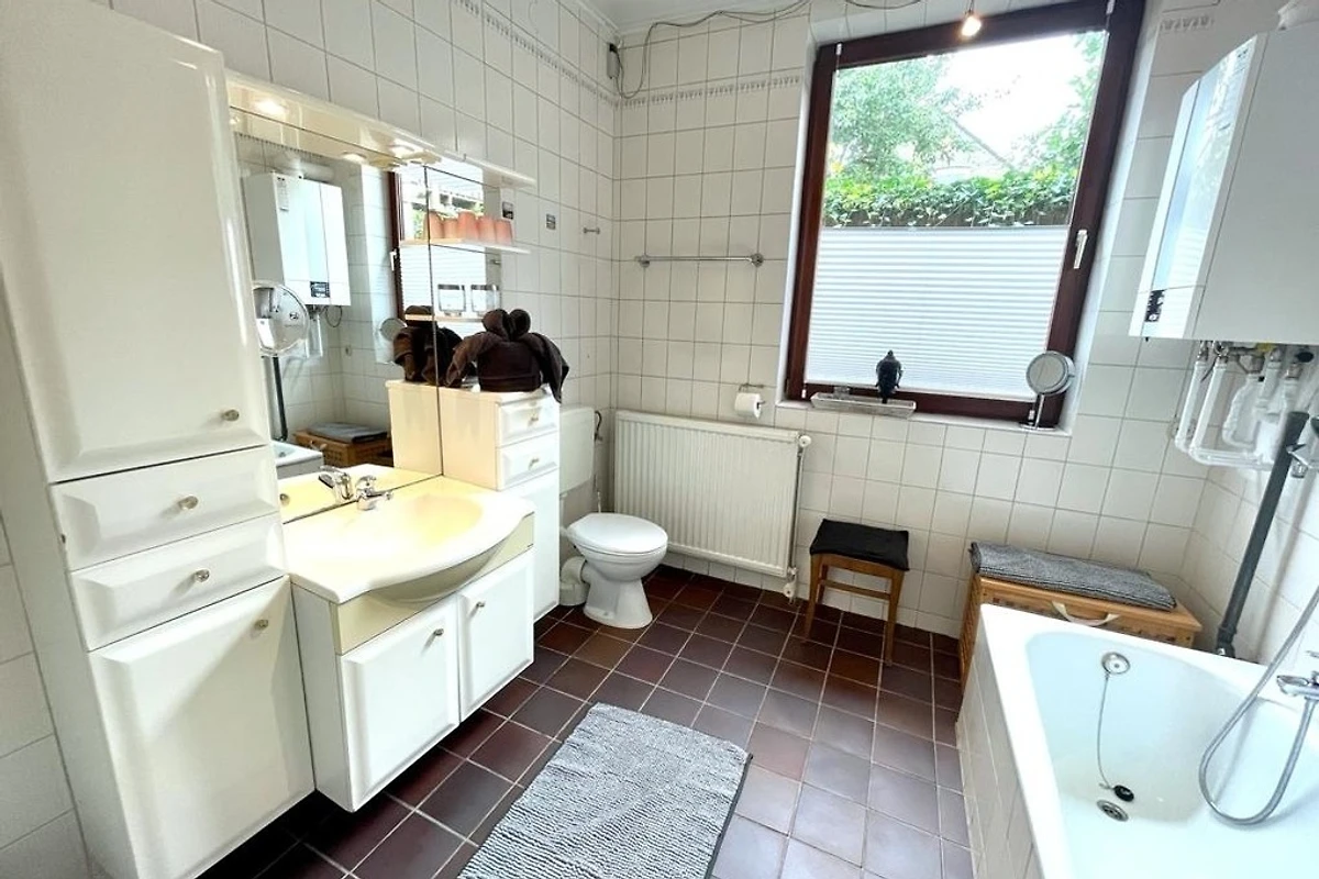 Im Erdgeschoss erwartet Sie ein Schlafzimmer mit einem Tagesbett 160*200 cm zum Ausziehen (2 getrennte Matratzen 80*200 cm) und einem weiteren Einzelbett 90*200 cm, sowie ein zweites Schlafzimmer mit einem Tagesbett 160*200 cm zum Ausziehen (2 getrennte Matratzen 80*200 cm) und das zweckmässig eingerichtete grosse Badezimmer mit Dusche, Badewanne, Waschbecken und Toilette.
