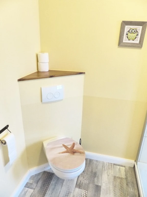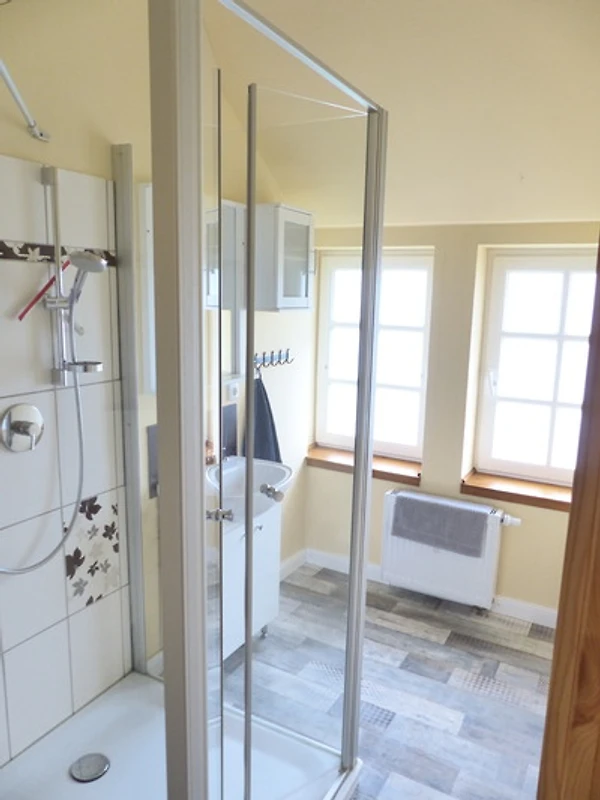 Die Einbauküche ist gut ausgestattet. Das Badezimmer verfügt über Dusche, Waschbecken und WC.