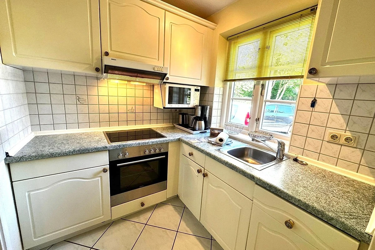 Richtige Urlaubsstimmung kommt auf der schönen Terrasse der Ferienwohnung auf. Im Urlaub kochen? Los geht´s, die Küche ist gut ausgestattet, sogar mit einer Spülmaschine.
