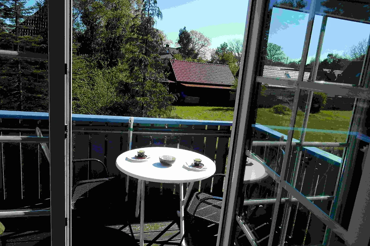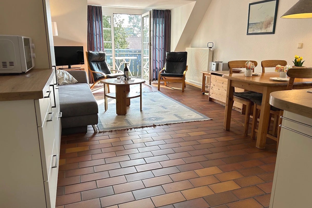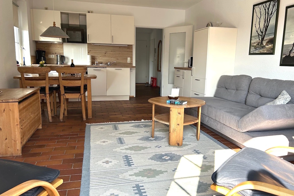 2 Zimmer ca. 50 qm für1-4 Personen, 1. OG im Gästehaus Kormoran, Waldstrasse 64 b, Ostseebad Prerow. Wohnzimmer mit Schafcouch, Sitzgarnitur, SAT-TV/Radio, WLAN, Esstisch, moderner Küchenzeile mit Backofen, Ceranfeld, Spülmaschine; Schlafzimmer mit Doppelbett, Dusche/WC, Gäste-WC, Süd-West-Balkon.