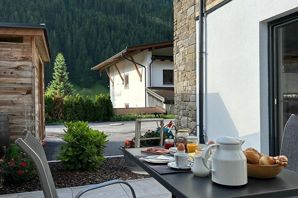 Der tägliche Brötchenservice lässt das Frühstück beim Sonnenaufgang über den Zillertaler Bergen zu einem kulinarischen Erlebnis werden.