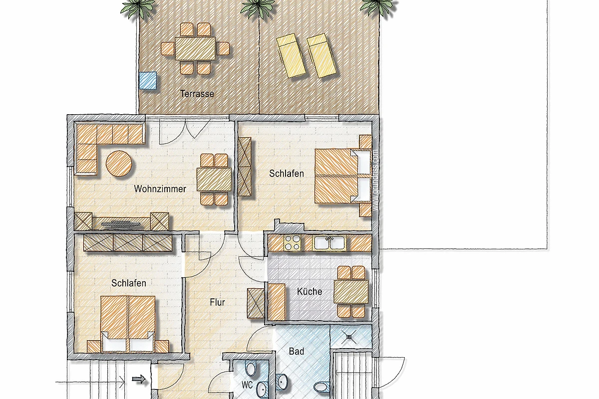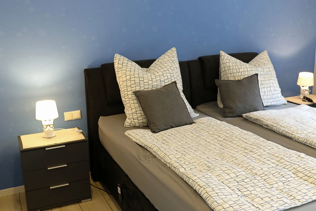 Sie erreichen die Wohnung über einen grosszügigen Eingangsbereich mit geräumigem Flur. Neben dem grosszügigen Wohnzimmer mit Essplatz und der modernen Küche mit weiterem Esstisch stehen Ihnen zwei Schlafzimmer sowie ein modernes Bad mit Dusch/WC und ein separates Gäste-EC zur Verfügung. Ein Schlafzimmer verfügt über ein Doppelbett, das andere über zwei Einzelbetten, die wahlweise auch zum Doppelbett zusammengestellt werden können.