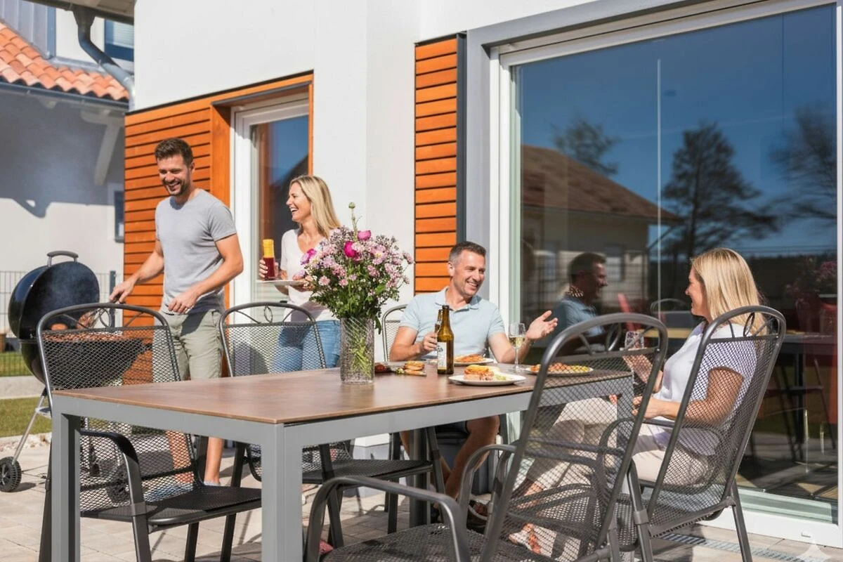 - Traumhafter Blick auf den Altdorfer See von unserer Südterrasse mit Esstisch, Sonnenschirm und Grill