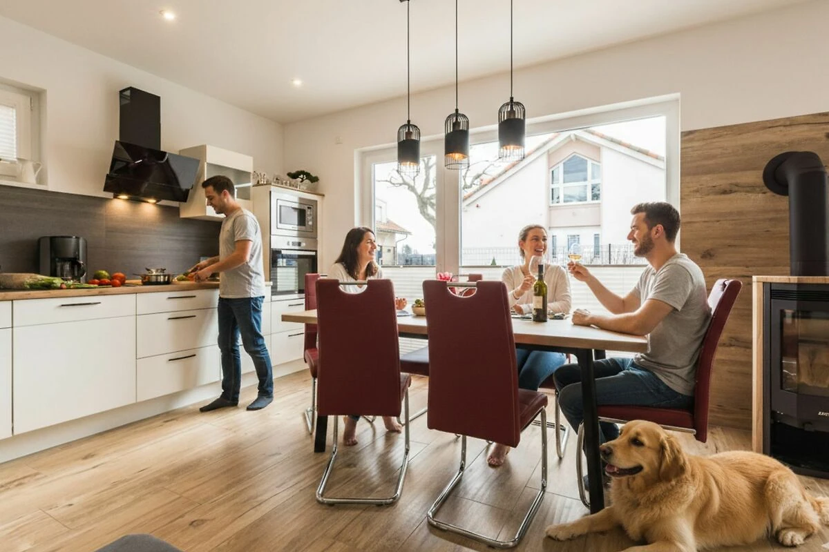 Die offene Küche bietet viel Platz und lässt keine Ausstattungswünsche offen. Ein Kamin sorgt für urige Wohlfühlstimmung und taucht den Wohnraum in ein magisches, wohliges Licht.