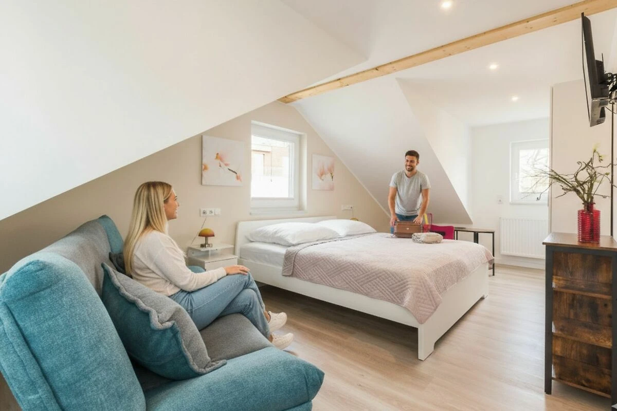 Hochwertige Betten und elektrische Rollläden versprechen erholsamen Schlaf und geben den Räumen eine zeitgemässe Note. Beide Schlafzimmer sind mit einem Fernseher ausgestattet.