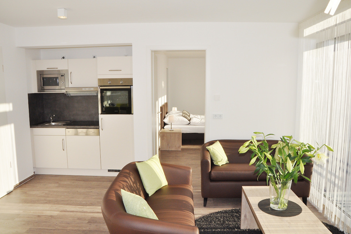 Wohnen, Erholen, Arbeiten, Lernen. Die Wohnungen & Studios im Aparthotel sind komplett eingerichtet. Hochwertige Materialien, lichtdurchflutete Räume und das erstklassige Design schaffen ein Umfeld für Menschen, die einen hohen Anspruch an Wohnkomfort haben. Die intelligente Innenarchitektur erschafft eine grosszügige Raumatmosphäre auf 34 oder 59 qm. Bei unserer Einrichtung mit Hotelservice wird auf Markenqualität gesetzt - ganz gleich, ob schwenkbarer LCD-Fernseher mit grossem Bildschirm oder offener Küchenbereich mit Herd, Mikrowelle, Spülmaschine und Kühlschrank. Gäste geniessen hier eine hohe Lebensqualität. Es ist alles in erstklassiger Qualität vorhanden: Selbst für Handtücher, Besteck, Gläser ist gesorgt.