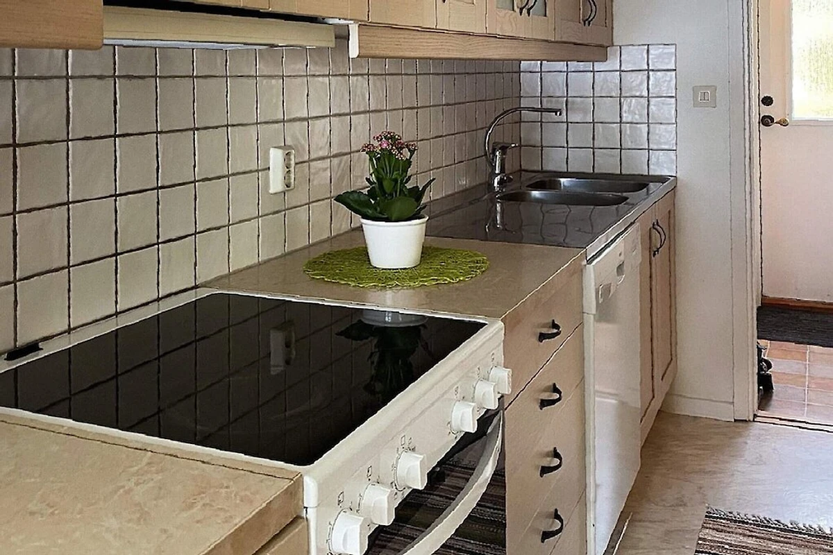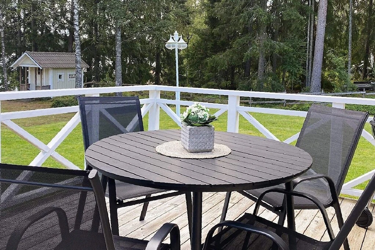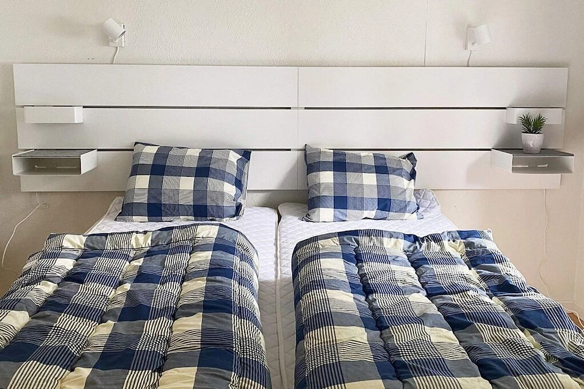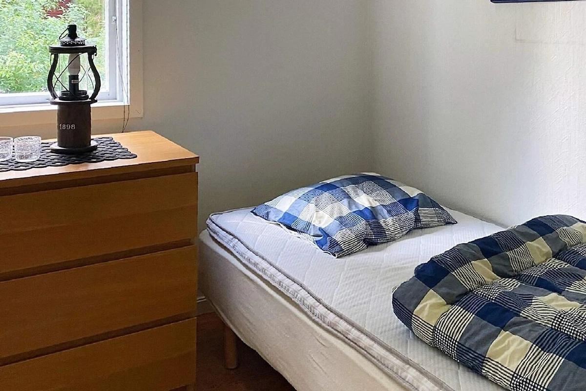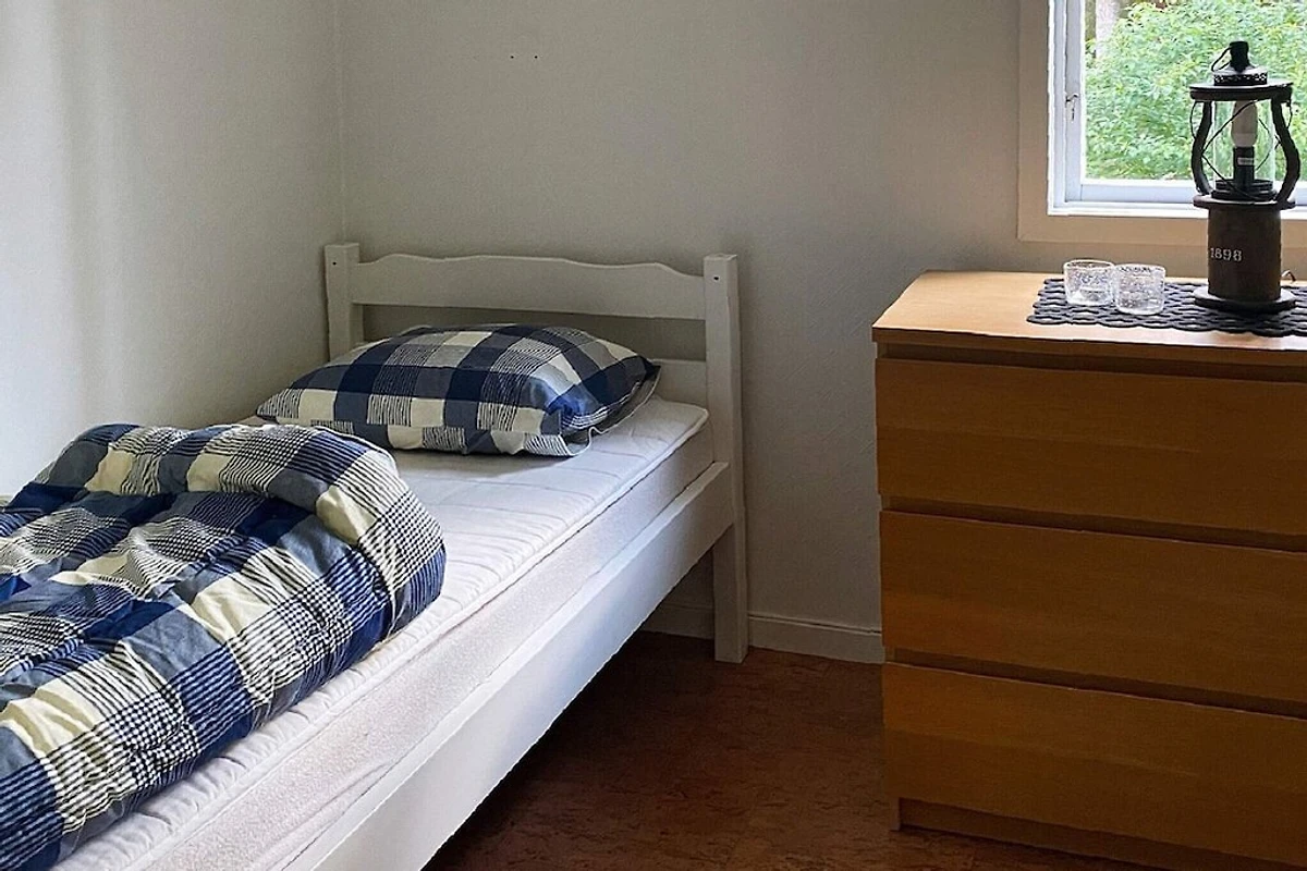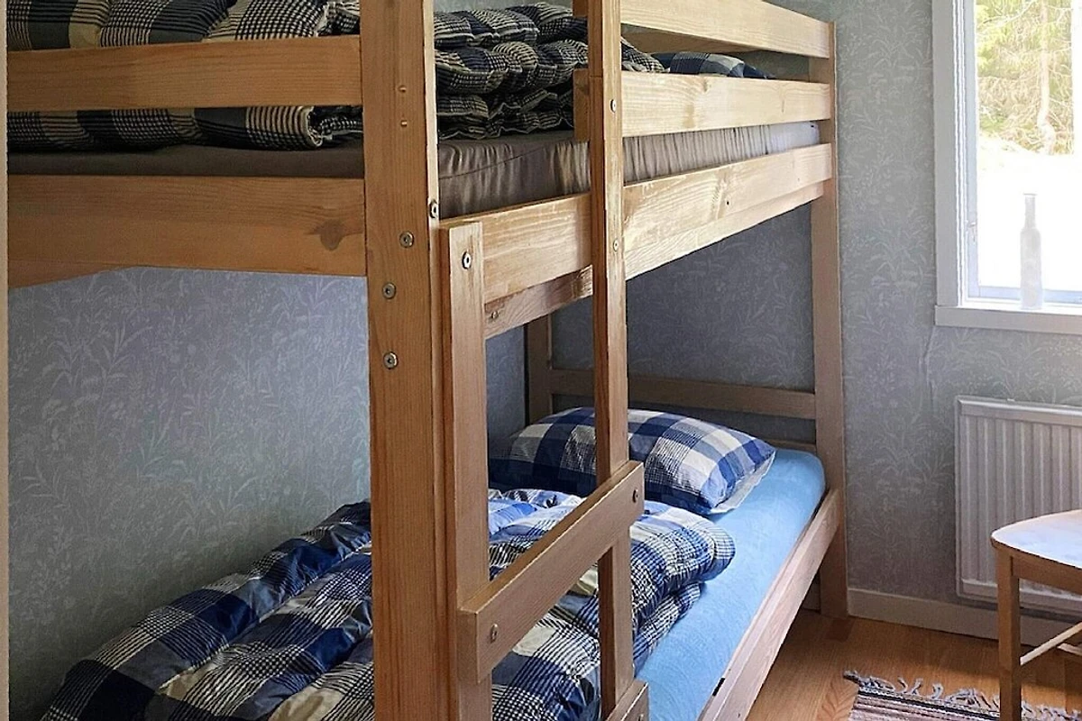 Offene Küche(Kochherd(elektrisch), Kaffeemaschine, Spülmaschine, Kühl-/Gefrierkombination), Wohn-/Schlafzimmer(TV(Deutsch Fernsehsender, schwedische Fernsehsender), Kaminofen), Schlafzimmer(Doppelbett), Schlafzimmer(2x Einzelbett), Schlafzimmer(2x Etagenbett), Badezimmer(Trockner, Waschbecken, Dusche, Toilette, Waschmaschine), Heizung(elektrisch), Terrasse(Gartenmöbel, Grill), Parkplatz