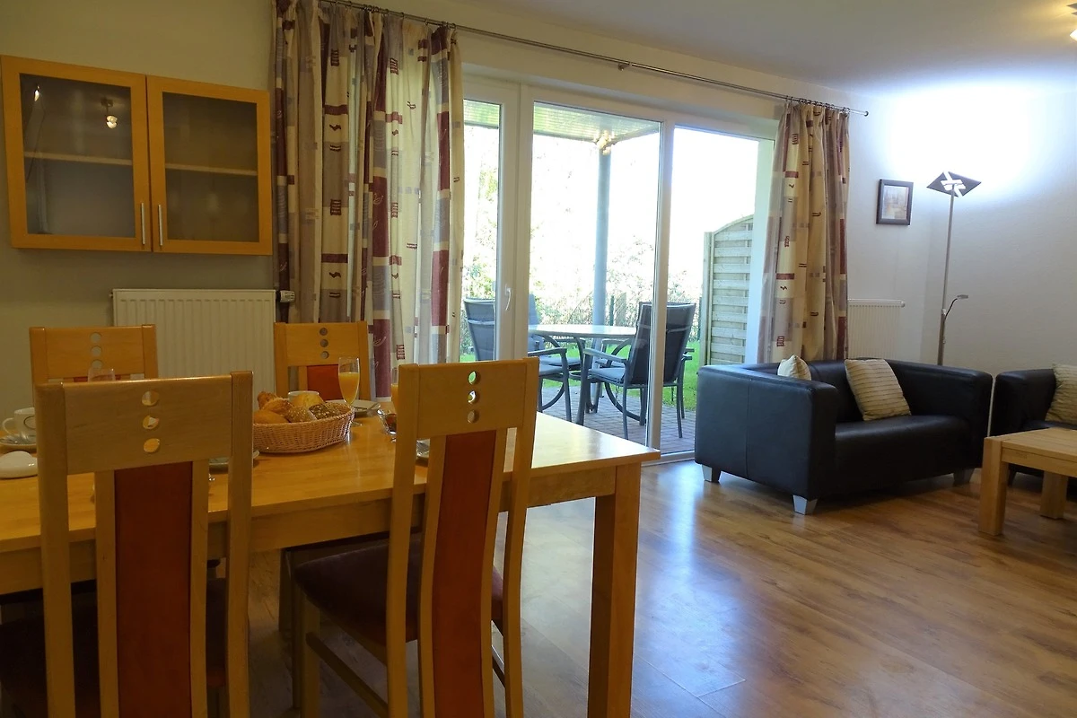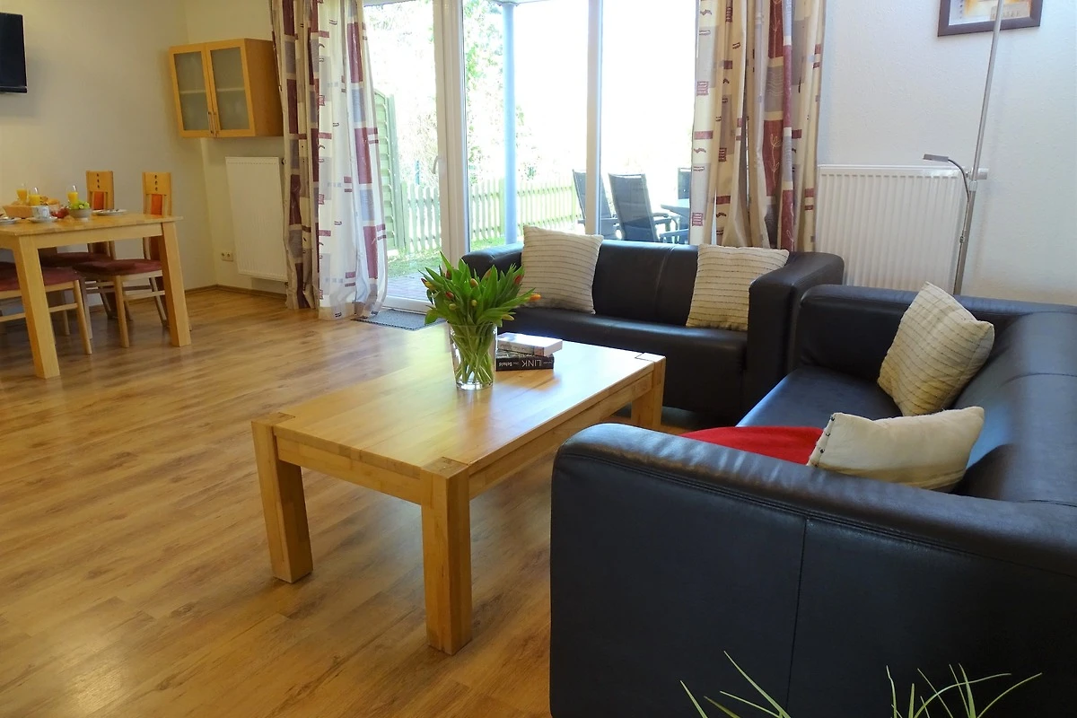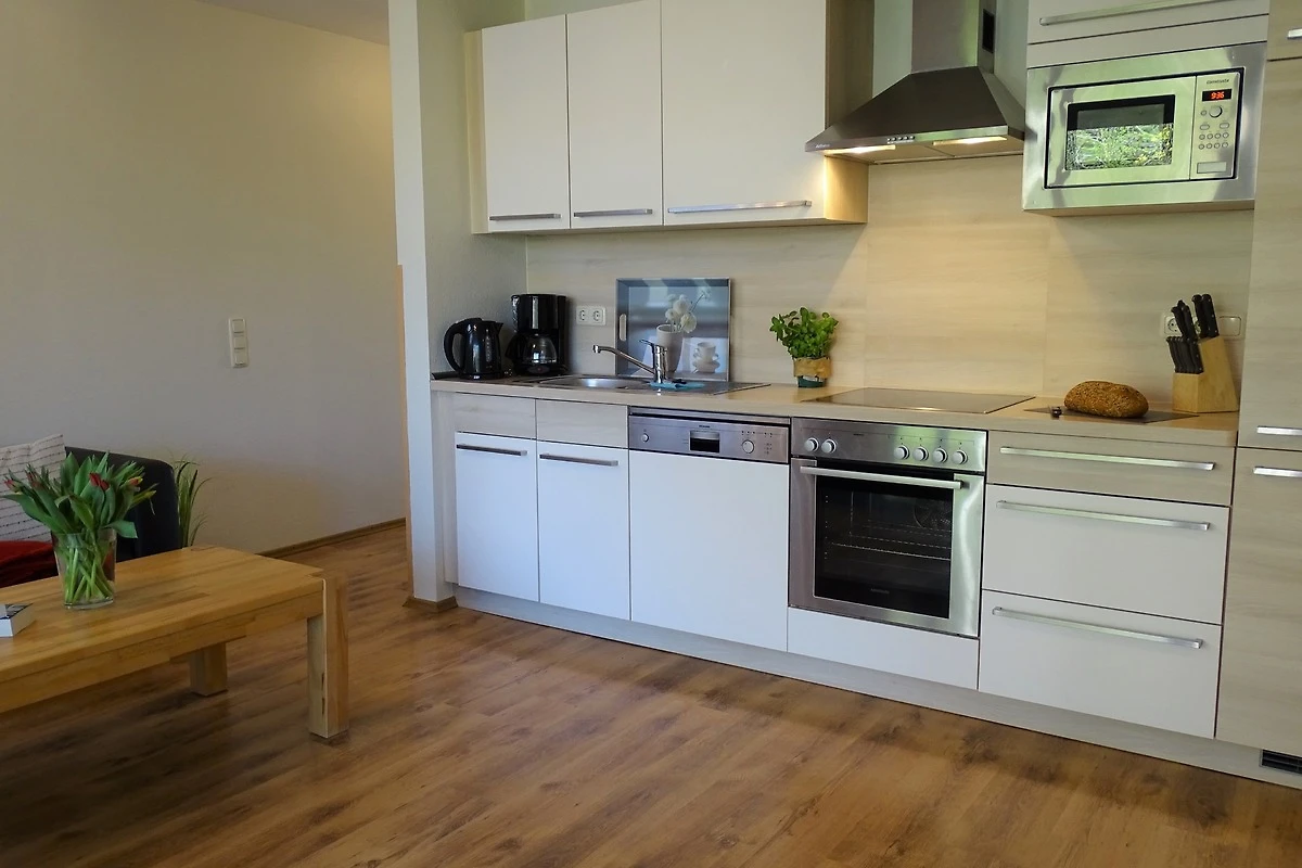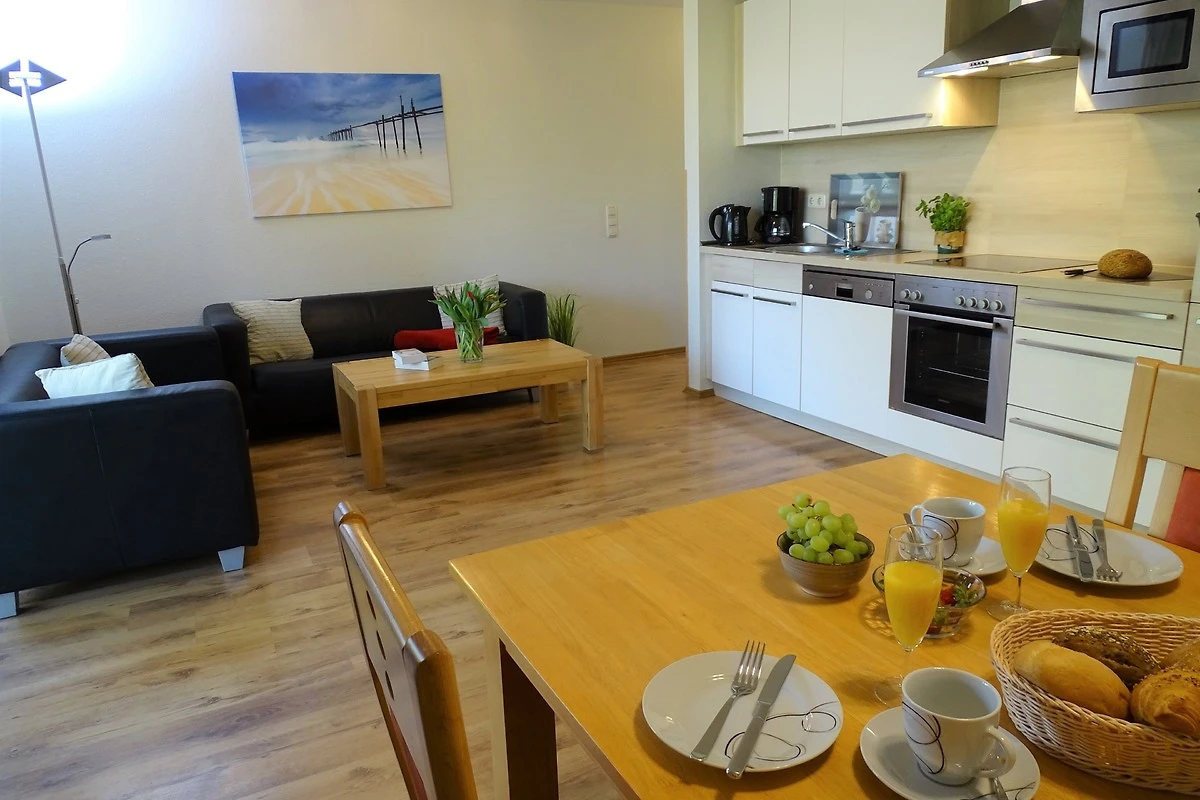 Unsere schöne und geräumige Ferienwohnung (ca.64m²) in ruhiger, strandnaher Lage ist ausgestattet für 4 Personen und verfügt über 2 separate Schlafzimmer. Sie bietet ein modernes Wohnzimmer mit Couch- und Essecke, SAT-Flachbild-TV und integrierte offene Küchenzeile. Die Einbauküche ist mit Geschirrspüler, Backofen, Ceranfeld, Mikrowelle, Kaffeemaschine, Toaster uvm. ausgestattet... Die Schlafzimmer (einmal mit Doppelbett und eines mit getrennt stehenden Einzelbetten) sind gemütlich eingerichtet. Das Duschbad ist hell und geräumig. Geniessen Sie Ihre Urlaubsstunden auch auf der sonnigen Terrasse direkt am Objekt.