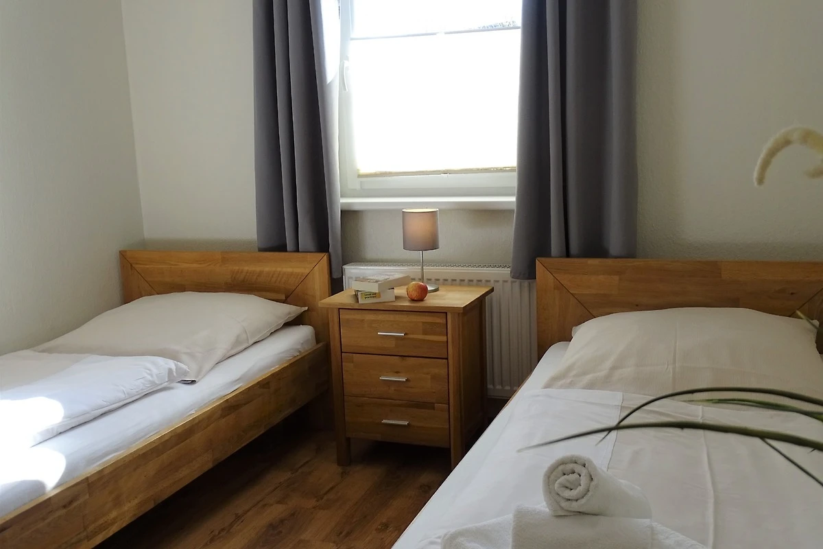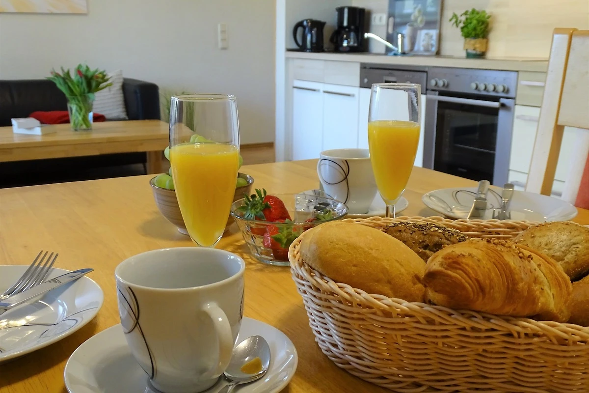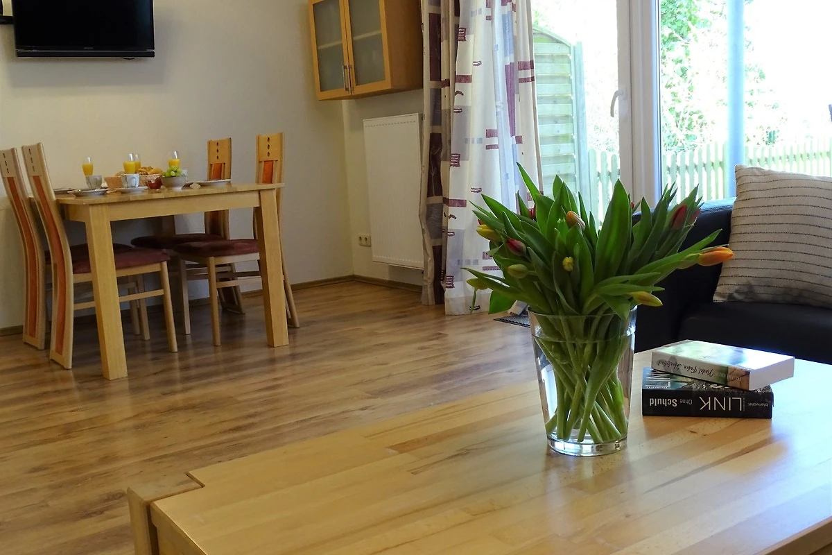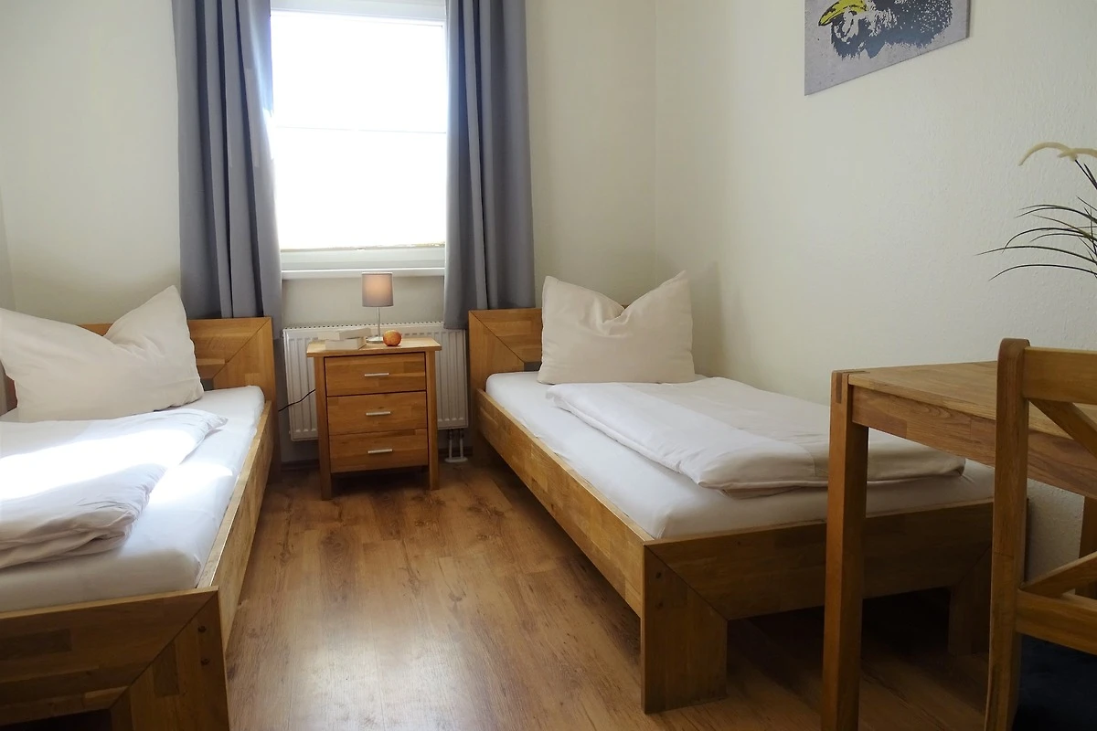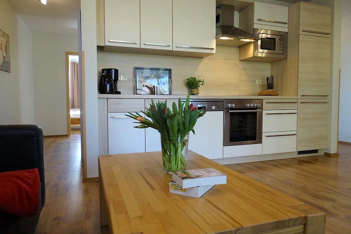 Unsere schöne und geräumige Ferienwohnung (ca.64m²) in ruhiger, strandnaher Lage ist ausgestattet für 4 Personen und verfügt über 2 separate Schlafzimmer. Sie bietet ein modernes Wohnzimmer mit Couch- und Essecke, SAT-Flachbild-TV und integrierte offene Küchenzeile. Die Einbauküche ist mit Geschirrspüler, Backofen, Ceranfeld, Mikrowelle, Kaffeemaschine, Toaster uvm. ausgestattet... Die Schlafzimmer (einmal mit Doppelbett und eines mit getrennt stehenden Einzelbetten) sind gemütlich eingerichtet. Das Duschbad ist hell und geräumig. Geniessen Sie Ihre Urlaubsstunden auch auf der sonnigen Terrasse direkt am Objekt.