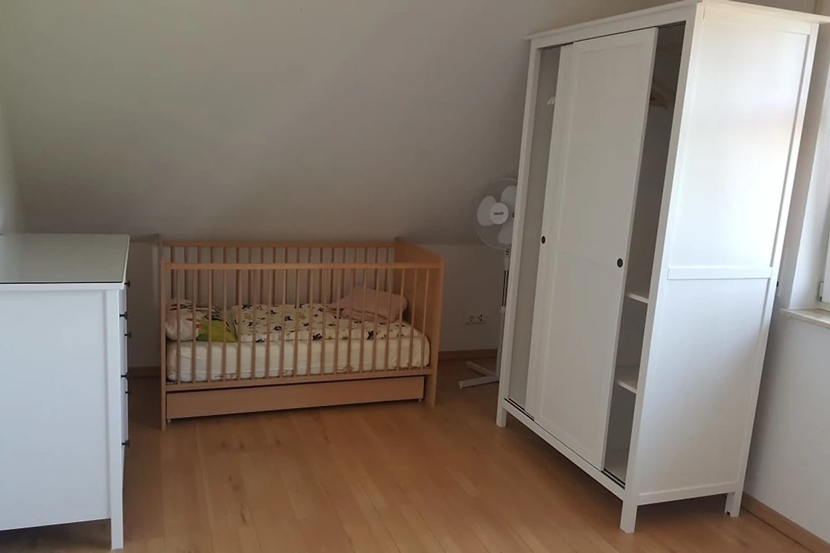 Ein Babybett und ein Hochstuhl stehen im Haus zur freien Verfügung