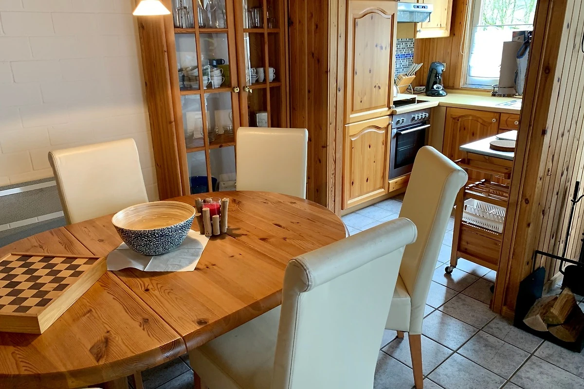 Im hellen Wohnraum befindet sich eine bequeme Sitzlandschaft, ein Essplatz für 5 Personen, sowie ein grosser Multimedia Smart-TV und ein Kaminofen. Der Internetzugang per Wlan ist im kompletten Haus sowie auf der Terrasse kostenlos vorhanden.