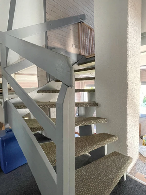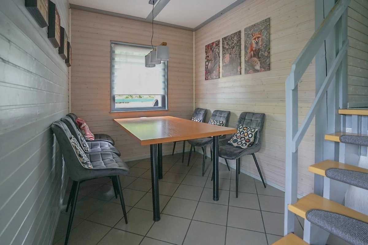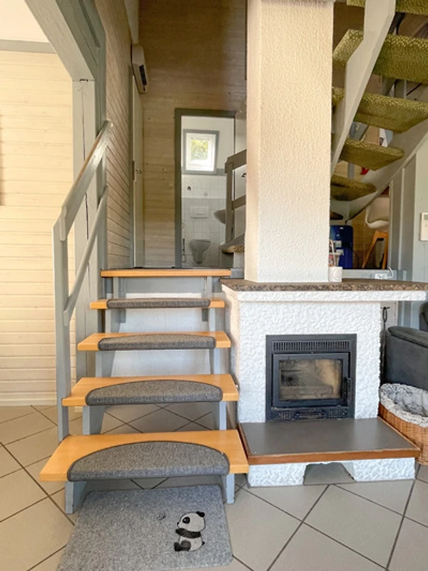 Im Erdgeschoss befindet sich der Eingang mit Windfang und Garderobe sowie der grosszügige Wohnraum mit Kamin. Von dort gelangt man auf eine schöne Empore mit Küche, Bad sowie einem Gäste-WC und einem Schlafraum mit Doppelbett.