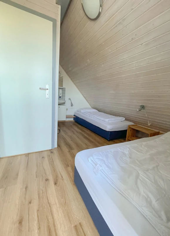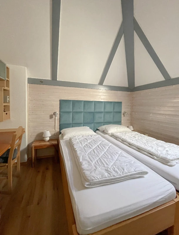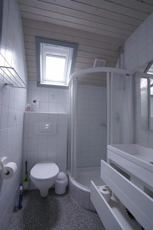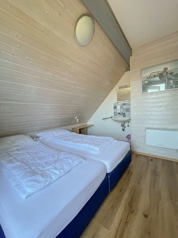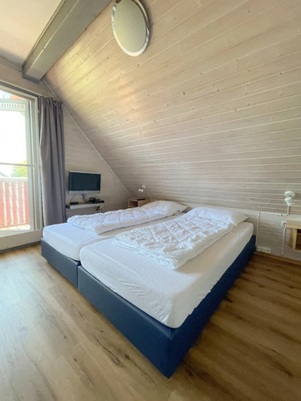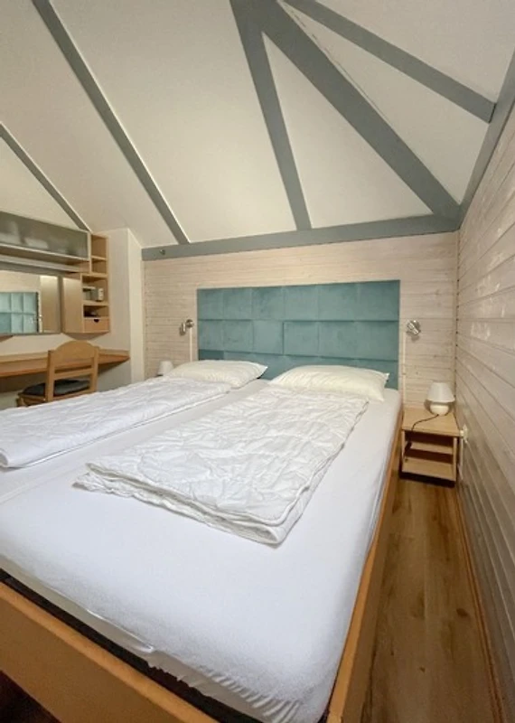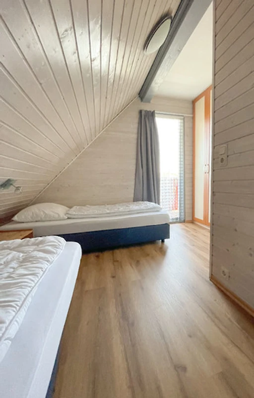 Im Obergeschoss liegen 2 weitere Schlafzimmer, das eine mit Doppelbett, das andere mit 2 separaten Betten. Darüber hinaus lädt im Obergeschoss ein grosser Balkon zum Entspannen ein und darunter im Erdgeschoss eine schöne Terrasse. Beide Schlafzimmer im DG verfügen je über einen eigenen Balkonzugang (Süden). Von hieraus können Sie die Blicke über den gesamten Ferienpark schweifen lassen.