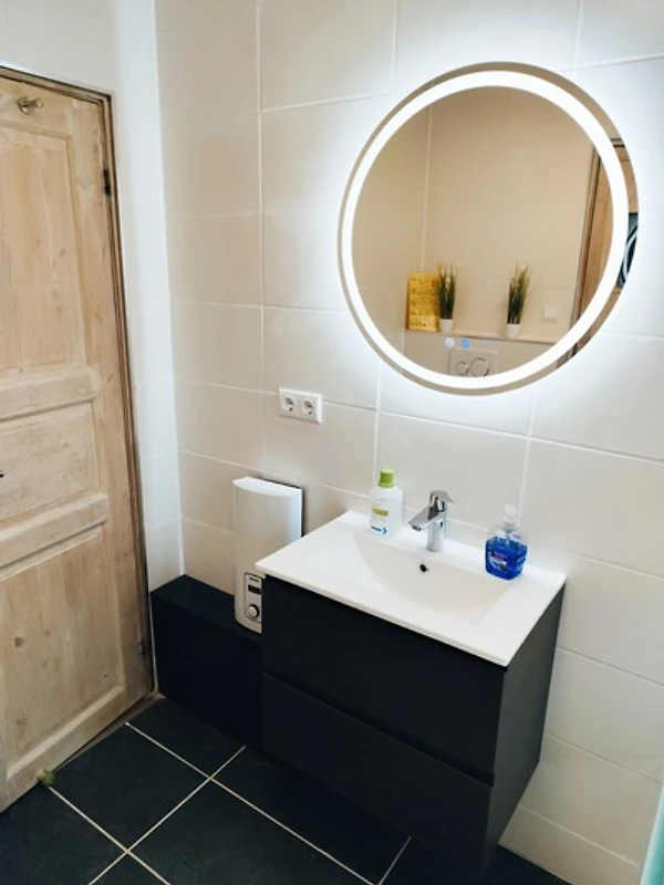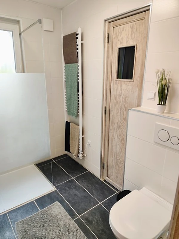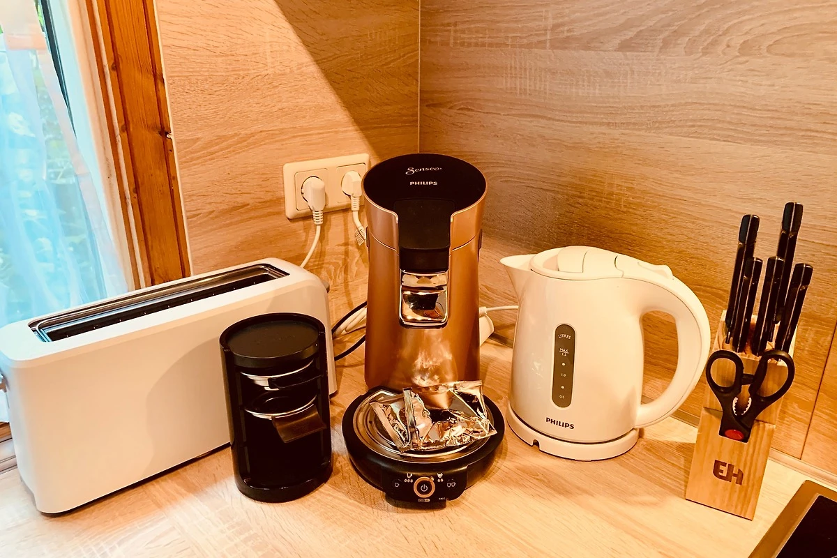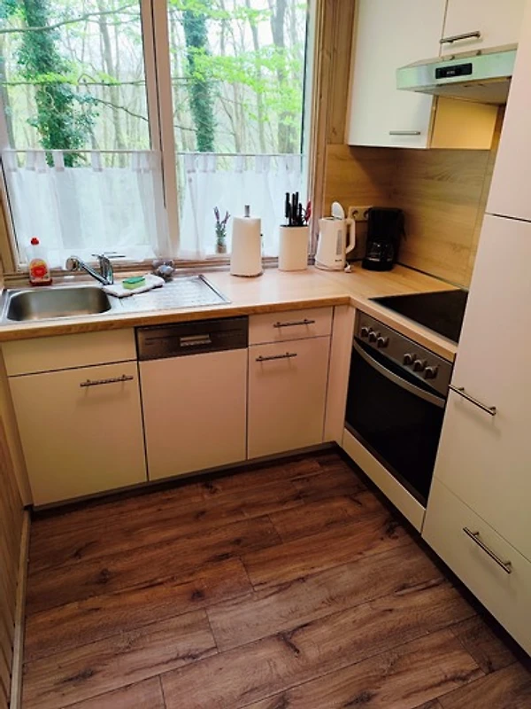 Die zum Wohnraum offene und neue Küche verfügt u.a. über einen Backofen und Ceranfeld, einen Kühlschrank mit Gefrierfach, Mikrowelle, Toaster, Wasserkocher und viele weitere wichtige Utensilien.